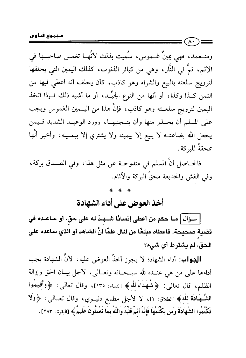 الجواب: أداء الشهادة لا يجوز أخذ العوض عليه؛ لأن الشهادة يجب أداءها على من هي عنده لله سبحانه وتعالى، لأجل بيان الحق وإزالة الظلم، قال تعالى: {شُهَدَاءَ لِلَّهِ} [النساء: 135] ، وقال تعالى: {وَأَقِيمُوا الشَّهَادَةَ لِلَّهِ} [الطلاق: 2] ، لا لأجل مطمع دنيوي، وقال تعالى: {وَلَا تَكْتُمُوا الشَّهَادَةَ وَمَنْ يَكْتُمْهَا فَإِنَّهُ آثِمٌ قَلْبُهُ وَاللَّهُ بِمَا تَعْمَلُونَ عَلِيمٌ} [البقرة: 283] .
