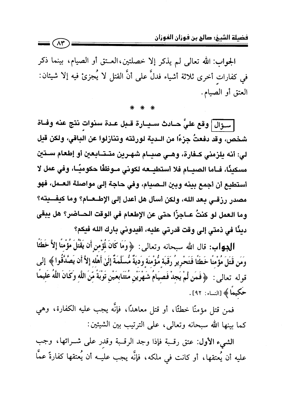 الجواب: قال الله سبحانه وتعالى: {وَمَا كَانَ لِمُؤْمِنٍ أَنْ يَقْتُلَ مُؤْمِنًا إِلَّا خَطَأً وَمَنْ قَتَلَ مُؤْمِنًا خَطَأً فَتَحْرِيرُ رَقَبَةٍ مُؤْمِنَةٍ وَدِيَةٌ مُسَلَّمَةٌ إِلَى أَهْلِهِ إِلَّا أَنْ يَصَّدَّقُوا} إلى قوله تعالى: {فَمَنْ لَمْ يَجِدْ فَصِيَامُ شَهْرَيْنِ مُتَتَابِعَيْنِ تَوْبَةً مِنَ اللَّهِ وَكَانَ اللَّهُ عَلِيمًا حَكِيمًا} [النساء: 92] .