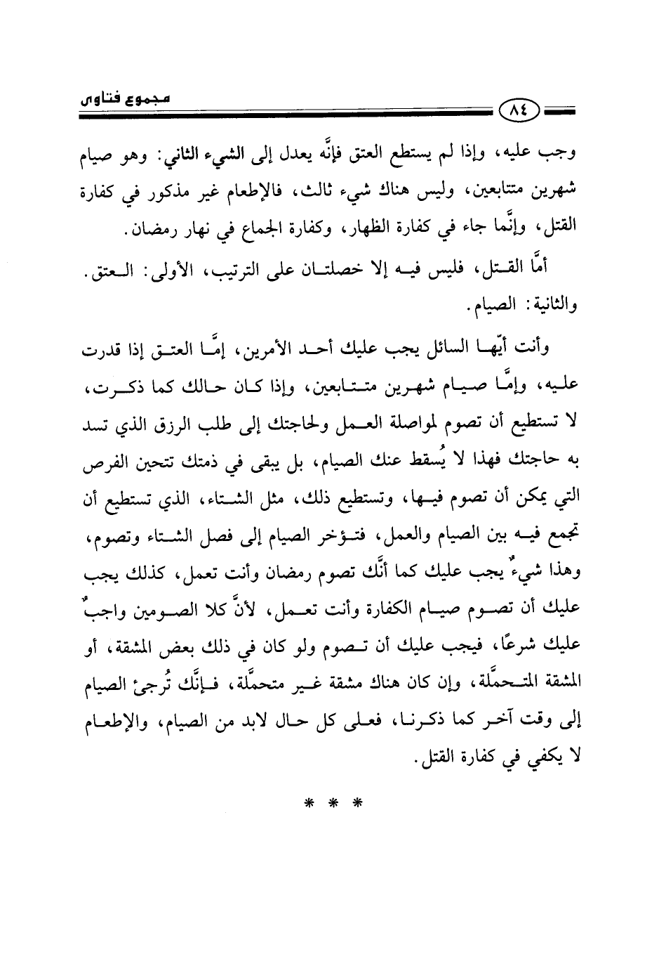 وأنت أيها السائل يجب عليك أحد الأمرين، إما العتق إذا قدرت عليه، وإما صيام شهرين متتابعين، وإذا كان حالك كما ذكرت، لا تستطيع أن تصوم لمواصلة العمل ولحاجتك إلى طلب الرزق الذي تسد به حاجتك، فهذا لا يسقط عنك الصيام، بل يبقى في ذمتك تتحين الفرص التي يمكن أن تصوم فيها، وتستطيع ذلك، مثل الشتاء، الذي تستطيع أن تجمع فيه بين الصيام والعمل، فتؤخر الصيام إلى فصل الشتاء وتصوم، وهذا شيء يجب عليك، كما أنك تصوم رمضان وأنت تعمل، كذلك يجب عليك أن تصوم صيام الكفارة وأنت تعمل؛ لأن كلا الصومين واجب عليك شرعًا، فيجب عليك أن تصوم ولو كان في ذلك بعض المشقة، أو المشقة المتحملة، وإن كان هناك مشقة غير متحملة، فإنك ترجئ الصيام إلى وقت آخر كما ذكرنا، فعلى كل حال لا بد من الصيام، والإطعام لا يكفي في كفارة القتل.