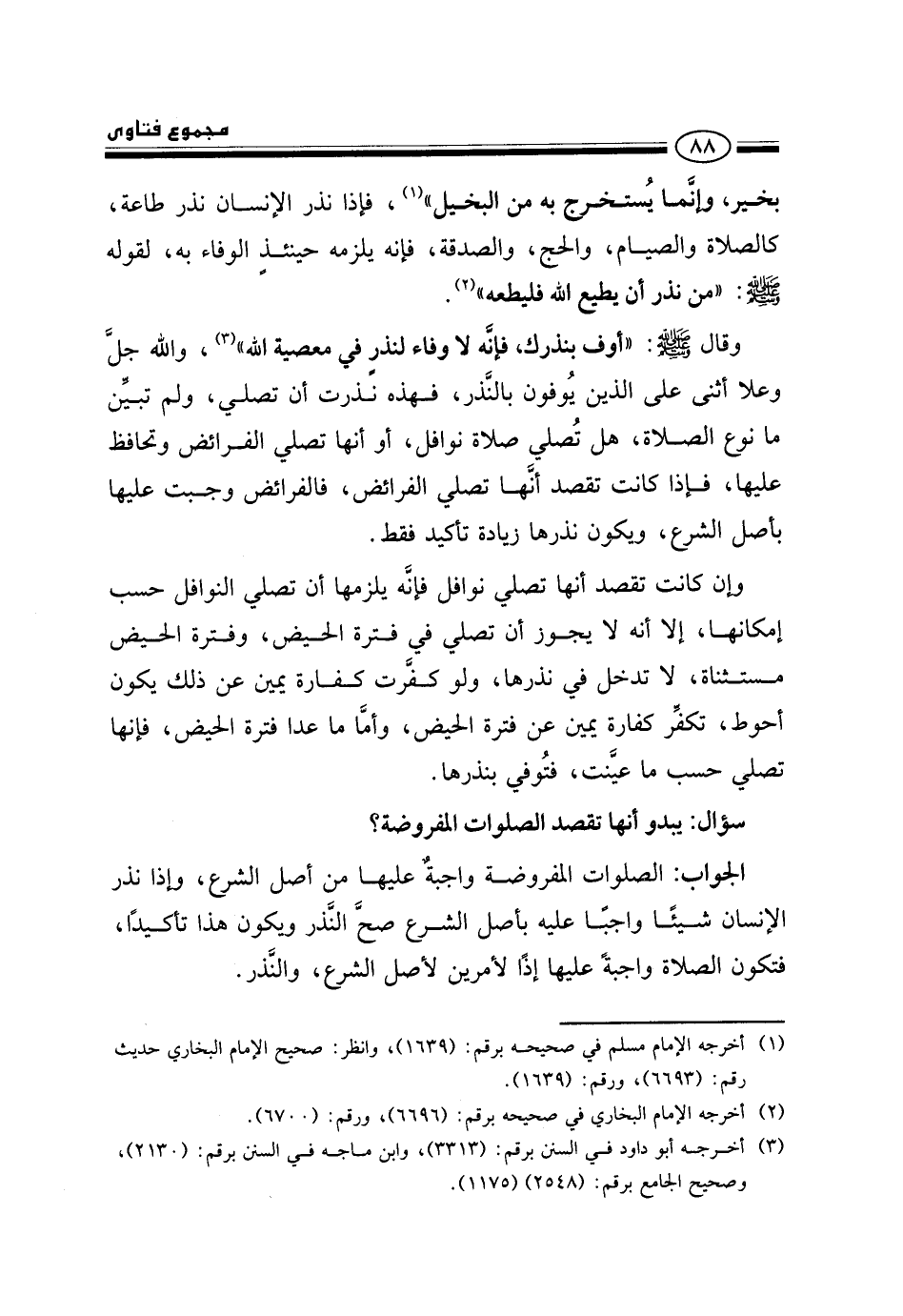 وقال صلى الله عليه وسلم: «أوف بنذرك، فإنه لا وفاء لنذر في معصية الله» ، والله جل وعلا أثنى على الذين يوفون بالنذر، فهذه نذرت أن تصلي، ولم تبين ما نوع الصلاة، هل تصلي صلاة نوافل، أو أنها تصلي الفرائض وتحافظ عليها، فإذا كانت تقصد أنها تصلي الفرائض، فالفرائض وجبت عليها بأصل الشرع، ويكون نذرها زيادة تأكيد فقط.