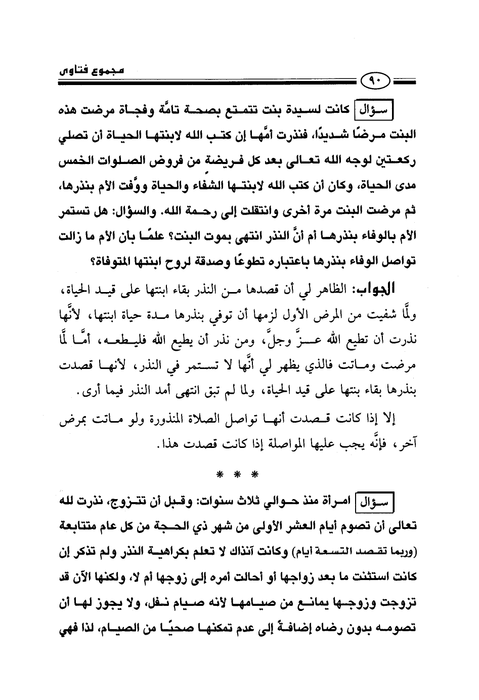سؤال: امرأة منذ حوالي ثلاث سنوات: وقبل أن تتزوج، نذرت لله تعالى أن تصوم أيام العشر الأولى من شهر ذي الحجة من كل عام متتابعة (وربما قصدت التسعة أيام) وكانت آنذاك لا تعلم بكراهية النذر ولم تذكر إن كانت استثنت ما بعد زواجها أو أحالت أمره إلى زوجها أم لا، ولكنها الآن قد تزوجت، وزوجها يمانع من صيامها لأنه صيام نفل، ولا يجوز لها أن تصومه بدون رضاه، إضافة إلى عدم تمكنها صحيًّا من الصيام، لذا فهي