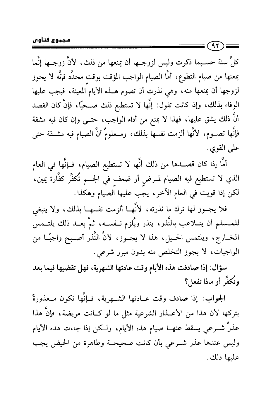 الجواب: إذا صادف وقت عادتها الشهرية، فإنه تكون معذورة بتركها لأن هذا من الأعذار الشرعية، مثل ما لو كانت مريضة، فإن هذا عذر شرعي يسقط عنها صيام هذه الأيام، ولكن إذا جاءت هذه الأيام وليس عندها عذر شرعي بأن كانت صحيحة وطاهرة من الحيض يجب عليها ذلك.