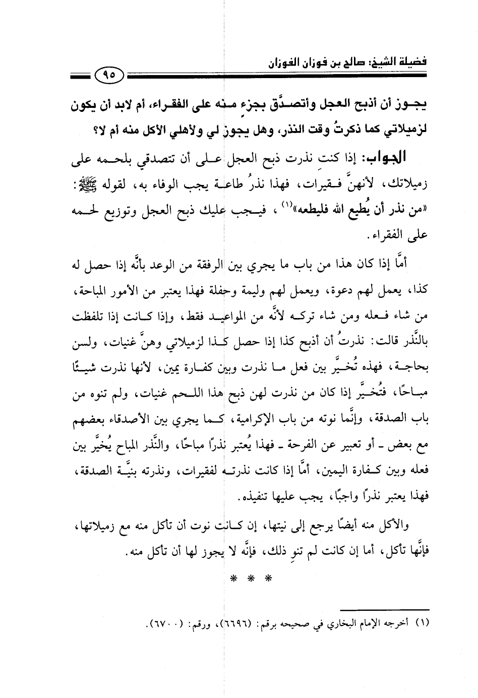أما إذا كان هذا من باب ما يجري بين الرفقة من الوعد بأنه إذا حصل له كذا، يعمل لهم دعوة، ويعمل لهم وليمة وحفلة فهذا يعتبر من الأمور المباحة، من شاء فعله ومن شاء تركه؛ لأنه من المواعيد فقط، وإذا كانت إذا تلفظت بالنذر قالت: نذرت أن أذبح كذا، إذا حصل كذا لزميلاتي وهن غنيات، ولسن بحاجة، فهذه تخير بين فعل ما نذرت وبين كفارة يمين؛ لأنها نذرت شيئًا مباحًا، فتخير إذا كان من نذرت لهن ذبح هذا اللحم غنيات، ولم تنوه من باب الصدقة، وإنما نوته من باب الإكرامية، كما يجري بين الأصدقاء بعضهم مع بعض - أو تعبير عن الفرحة - فهذا يعتبر نذرًا مباحًا، والنذر المباح يخير بين فعله وبين كفارة اليمين، أما إذا كانت نذرته لفقيرات، ونذرته بنية الصدقة، فهذا يعتبر نذرًا واجبًا، يجب عليها تنفيذه.