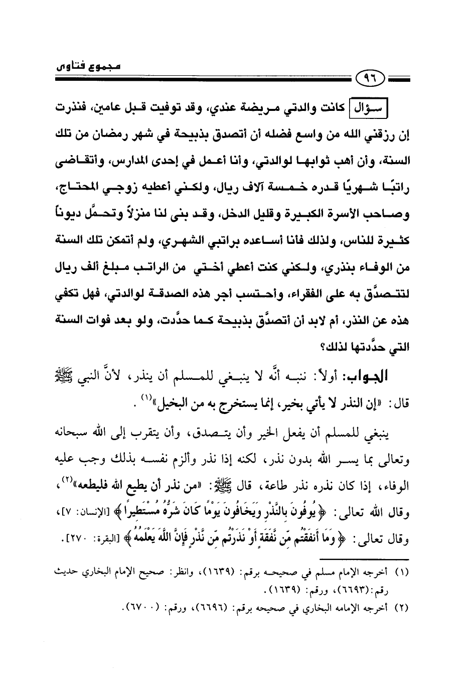 ينبغي للمسلم أن يفعل الخير وأن يتصدق، وأن يتقرب إلى الله سبحانه وتعالى بما يسر الله بدون نذر، لكنه إذا نذر وألزم نفسه بذلك وجب عليه الوفاء، إذا كان نذره نذر طاعة، قال صلى الله عليه وسلم: «من نذر أن يطيع الله فليطعه» ، وقال تعالى: {يُوفُونَ بِالنَّذْرِ وَيَخَافُونَ يَوْمًا كَانَ شَرُّهُ مُسْتَطِيرًا} [الإنسان:7] ، وقال تعالى: {وَمَا أَنْفَقْتُمْ مِنْ نَفَقَةٍ أَوْ نَذَرْتُمْ مِنْ نَذْرٍ فَإِنَّ اللَّهَ يَعْلَمُهُ} [البقرة: 270] .