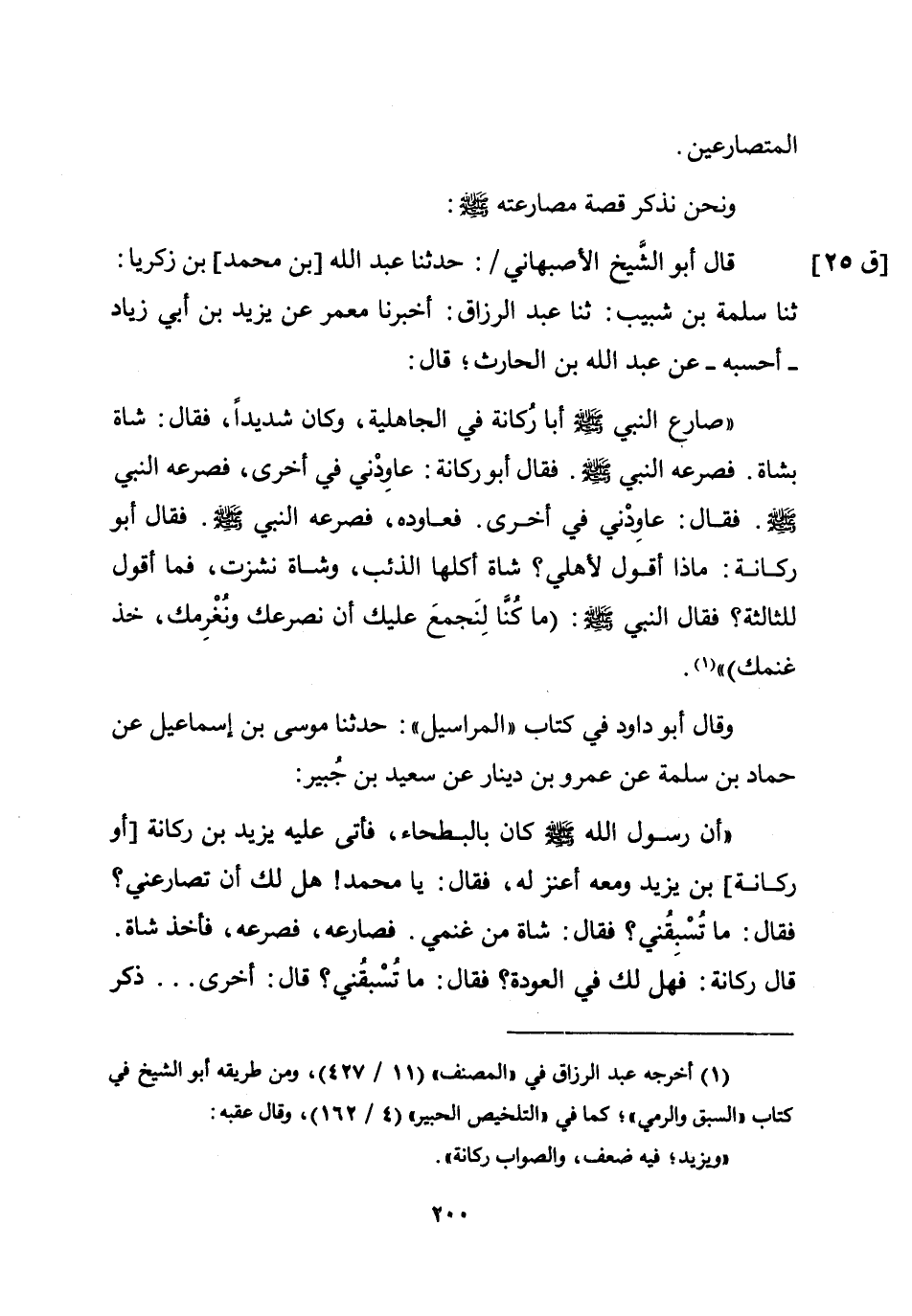 المتصارعين وَنحن نذْكر قصَّة مصارعته صلى الله عَلَيْهِ وَسلم قَالَ أَبُو الشَّيْخ الْأَصْبَهَانِيّ حَدثنَا عبد الله بن مُحَمَّد بن زَكَرِيَّا ثَنَا سَلمَة بن شبيب ثَنَا عبد الرَّزَّاق أخبرنَا معمر عَن يزِيد بن أبي زِيَاد أَحْسبهُ عَن عبد الله بن الْحَارِث قَالَ صارع النَّبِي صلى الله عَلَيْهِ وَسلم أَبَا ركَانَة فِي الْجَاهِلِيَّة وَكَانَ شَدِيدا فَقَالَ شَاة بِشَاة فصرعه النَّبِي صلى الله عَلَيْهِ وَسلم فَقَالَ أَبُو ركَانَة عاودني فِي أُخْرَى فصرعه النَّبِي صلى الله عَلَيْهِ وَسلم فَقَالَ عاودني فِي أُخْرَى فعاوده فصرعه النَّبِي صلى الله عَلَيْهِ وَسلم فَقَالَ أَبُو ركَانَة مَاذَا أَقُول لأهلي شَاة أكلهَا الذِّئْب وشَاة نشزت فَمَا أَقُول للثالثة فَقَالَ النَّبِي صلى الله عَلَيْهِ وَسلم مَا كُنَّا لنجمع عَلَيْك أَن نصرعك ونغرمك خُذ غنمك وَقَالَ أَبُو دَاوُد فِي كتاب الْمَرَاسِيل حَدثنَا مُوسَى بن إِسْمَاعِيل عَن حَمَّاد بن سَلمَة عَن عَمْرو بن دِينَار عَن سعيد بن جُبَير أَن رَسُول الله صلى الله عَلَيْهِ وَسلم كَانَ بالبطحاء فَأتى عَلَيْهِ يزِيد بن ركَانَة أَو ركَانَة بن يزِيد وَمَعَهُ أعنز لَهُ فَقَالَ يَا مُحَمَّد هَل لَك أَن تصارعني فَقَالَ مَا تسبقني فَقَالَ شَاة من غنمي فصارعه فصرعه فَأخذ شَاة قَالَ ركَانَة فَهَل لَك فِي العودة فَقَالَ مَا تسبقني قَالَ أُخْرَى ذكر