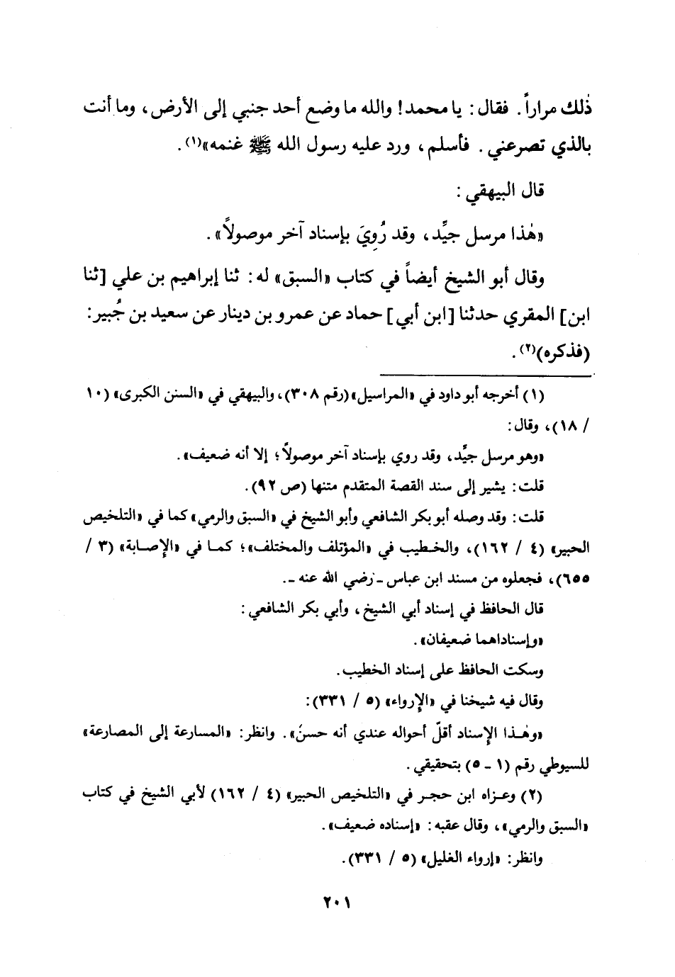 ذَلِك مرَارًا فَقَالَ يَا مُحَمَّد وَالله مَا وضع أحد جَنْبي إِلَى الأَرْض وَمَا أَنْت بِالَّذِي تصرعني فَأسلم ورد عَلَيْهِ رَسُول الله صلى الله عَلَيْهِ وَسلم غنمه قَالَ الْبَيْهَقِيّ هَذَا مُرْسل جيد وَقد رُوِيَ بِإِسْنَاد آخر مَوْصُولا وَقَالَ أَبُو الشَّيْخ أَيْضا فِي كتاب السَّبق لَهُ ثَنَا إِبْرَاهِيم بن عَليّ ثَنَا ابْن الْمقري حَدثنَا ابْن أبي حَمَّاد عَن عَمْرو بن دِينَار عَن سعيد بن جُبَير فَذكره
