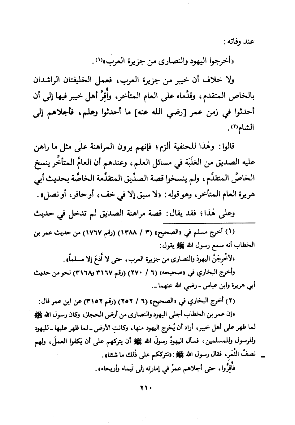 عِنْد وَفَاته أخرجُوا الْيَهُود وَالنَّصَارَى من جَزِيرَة الْعَرَب وَلَا خلاف أَن خَيْبَر من جَزِيرَة الْعَرَب فَعمل الخليفتان الراشدان بالخاص الْمُتَقَدّم وَقَدمَاهُ على الْعَام الْمُتَأَخر وَأقر أهل خَيْبَر فِيهَا إِلَى أَن أَحْدَثُوا فِي زمن عمر رَضِي الله عَنهُ مَا أَحْدَثُوا وَعلم فأجلاهم إِلَى الشَّام قَالُوا وَهَذَا للحنفية ألزم فَإِنَّهُم يرَوْنَ الْمُرَاهنَة على مثل مَا رَاهن عَلَيْهِ الصّديق من الْغَلَبَة فِي مسَائِل الْعلم وَعِنْدهم أَن الْعَام الْمُتَأَخر ينْسَخ الْخَاص الْمُتَقَدّم وَلم ينسخوا قصَّة الصّديق الْمُتَقَدّمَة الْخَاصَّة بِحَدِيث أبي هُرَيْرَة الْعَام الْمُتَأَخر وَهُوَ قَوْله لَا سبق إِلَّا فِي خف أَو حافر أَو نصل وعَلى هَذَا فقد يُقَال قصَّة مراهنة الصّديق لم تدخل فِي حَدِيث