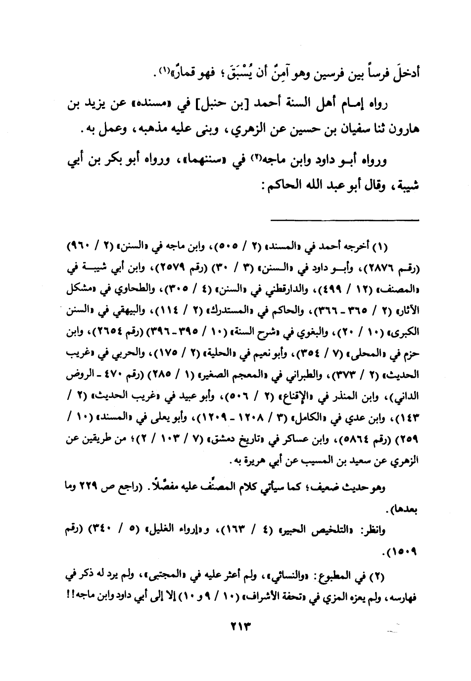 رَوَاهُ إِمَام أهل السّنة أَحْمد [بن حَنْبَل] فِي مُسْنده عَن يزِيد بن هَارُون ثَنَا سُفْيَان بن حُسَيْن عَن الزُّهْرِيّ وَبنى عَلَيْهِ مذْهبه وَعمل بِهِ وَرَوَاهُ أَبُو دَاوُد وَابْن مَاجَه فِي سُنَنهمَا وَرَوَاهُ أَبُو بكر بن أبي شَيْبه وَقَالَ أَبُو عبد الله الْحَاكِم: