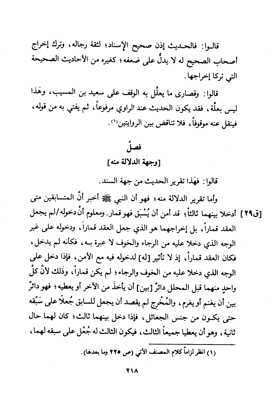 قَالُوا فَهَذَا تَقْرِير الحَدِيث من جِهَة السَّنَد وَأما تَقْرِير الدّلَالَة مِنْهُ فَهُوَ أَن النَّبِي صلى الله عَلَيْهِ وَسلم أخبر أَن المتسابقين مَتى أدخلا بَينهمَا ثَالِثا قد أَمن أَن يسْبق فَهُوَ قمار وَمَعْلُوم أَن دُخُوله لم يَجْعَل العقد قمارا بل إخراجهما هُوَ الَّذِي جعل العقد قمارا ودخوله على غير الْوَجْه الَّذِي دخلا عَلَيْهِ من الجراء وَالْخَوْف لَا عِبْرَة بِهِ فَكَأَنَّهُ لم يدْخل فَكَانَ العقد قمارا إِذْ لَا تَأْثِير [لَهُ] لدُخُوله فِيهِ مَعَ الْأَمْن فَإِذا دخل على الْوَجْه الَّذِي دخلا عَلَيْهِ من الْخَوْف والرجاء لم يكن قمارا وَذَلِكَ لِأَن كل وَاحِد مِنْهُمَا قبل الْمُحَلّل دائر [بَين] أَن يَأْخُذ من الآخر أَو يُعْطِيهِ فَهُوَ دائر بَين أَن يغنم أَو يغرم والمخرج لم يقْصد أَن يَجْعَل للسابق جعلا على سبقه حَتَّى يكون من جنس الجعائل فَإِذا دخل بَينهمَا ثَالِث كَانَ لَهما حَال ثَانِيَة وَهُوَ أَن يعطيا جَمِيعًا الثَّالِث فَيكون الثَّالِث لَهُ جعل على سبقه لَهما