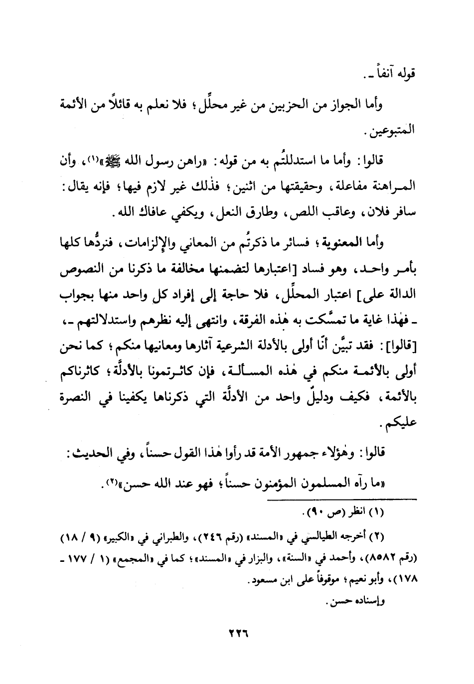 قَالُوا وَهَؤُلَاء جُمْهُور الْأمة قد رَأَوْا هَذَا القَوْل حسنا وَفِي الحَدِيث مَا رأه الْمُسلمُونَ الْمُؤْمِنُونَ حسنا فَهُوَ عِنْد الله حسن