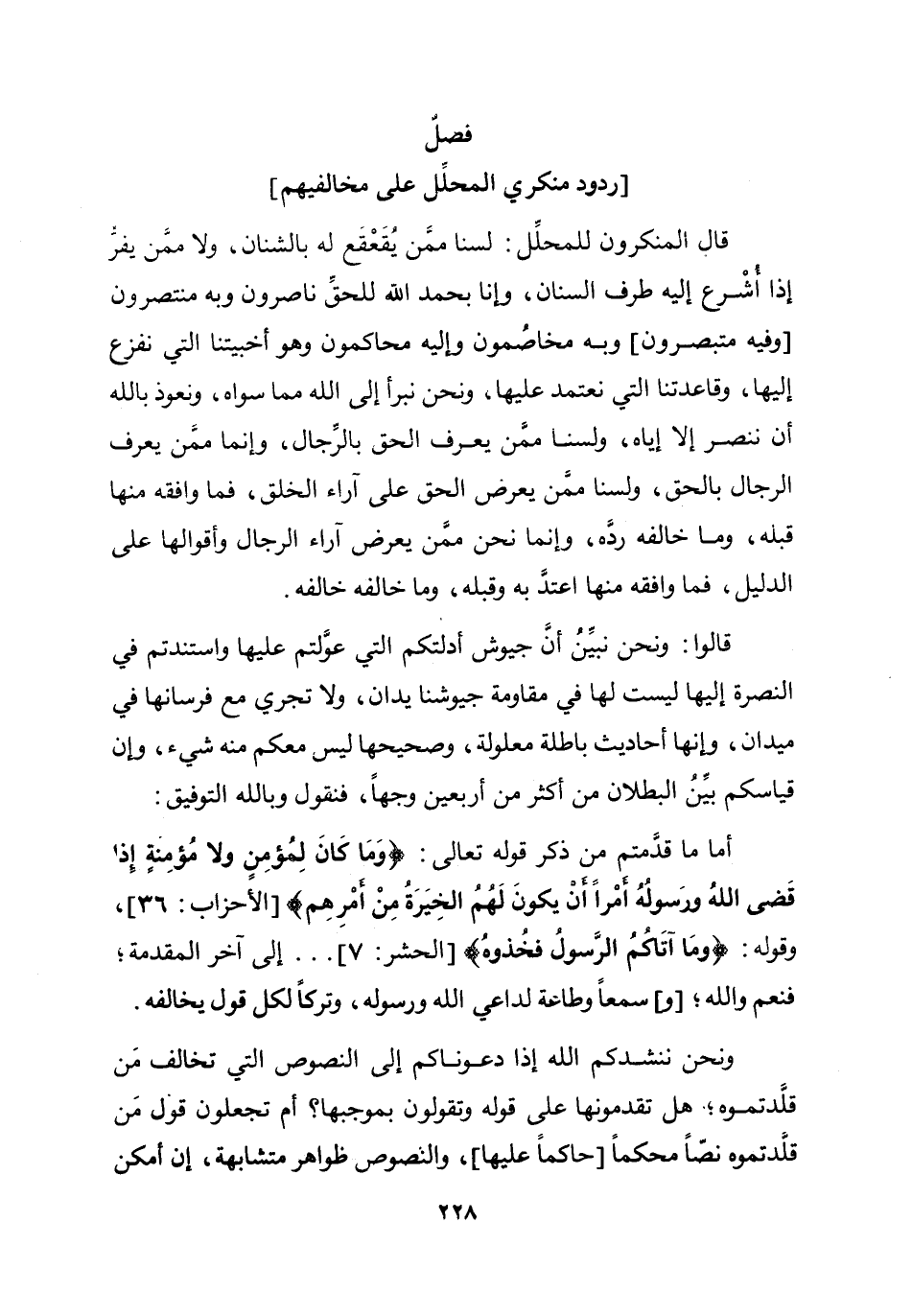 قَالَ المنكرون للمحلل لسنا مِمَّن يقعقع لَهُ بالشنان وَلَا مِمَّن يفر إِذا أشرع إِلَيْهِ طرف السنان وَإِنَّا بِحَمْد الله للحق ناصرون وَبِه منتصرون [وَفِيه متبصرون] وَبِه مخاصمون وَإِلَيْهِ محاكمون وَهُوَ أخبيتنا الَّتِي نفزع اليها وقاعدتنا الَّتِي نعتمد عَلَيْهَا وَنحن نبرأ إِلَى الله مِمَّا سواهُ ونعوذ بِاللَّه ان ننصر إِلَّا اياه ولسنا مِمَّن يعرف الْحق بِالرِّجَالِ وَإِنَّمَا مِمَّن يعرف الرِّجَال بِالْحَقِّ ولسنا مِمَّن يعرض الْحق على آراء الْخلق فَمَا وَافقه مِنْهَا قبله وَمَا خَالفه رده وَإِنَّمَا نَحن مِمَّن يعرض آراء الرِّجَال وأقوالها على الدَّلِيل فَمَا وَافقه مِنْهَا اعْتد بِهِ وَقَبله وَمَا خَالفه خَالفه