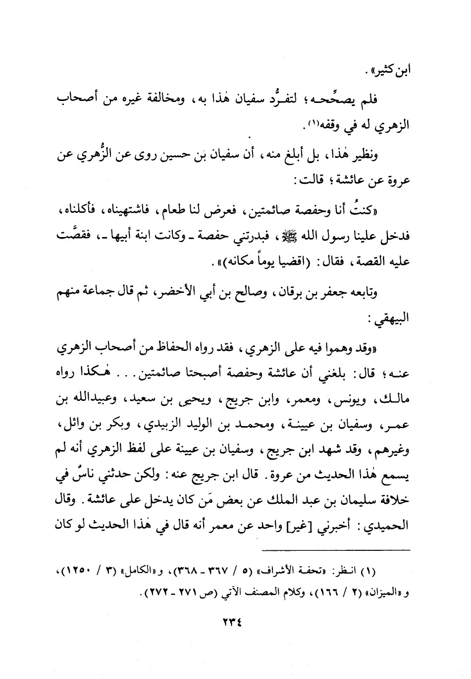 وَتَابعه جَعْفَر بن برْقَان وَصَالح بن ابي الْأَخْضَر ثمَّ قَالَ جمَاعَة مِنْهُم الْبَيْهَقِيّ وَقد وهموا فِيهِ على الزُّهْرِيّ فقد رَوَاهُ الْحفاظ من أَصْحَاب الزُّهْرِيّ عَنهُ قَالَ بَلغنِي أَن عَائِشَة وَحَفْصَة أصبحتا صائمتين هَكَذَا رَوَاهُ مَالك وَيُونُس وَمعمر وَابْن جريج وَيحيى بن سعيد وَعبيد الله بن عمر وسُفْيَان بن عيينه وَمُحَمّد بن الْوَلِيد الزبيدِيّ وَبكر بن وَائِل وَغَيرهم وَقد شهد ابْن جريج وسُفْيَان بن عُيَيْنَة على لفظ الزُّهْرِيّ أَنه لم يسمع هَذَا الحَدِيث من عُرْوَة قَالَ ابْن جريج عَنهُ وَلَكِن حَدثنِي نَاس فِي خلَافَة سُلَيْمَان بن عبد الْملك عَن بعض من كَانَ يدْخل على عَائِشَة وَقَالَ الْحميدِي أَخْبرنِي [غير] وَاحِد عَن معمر أَنه قَالَ فِي هَذَا الحَدِيث لَو كَانَ