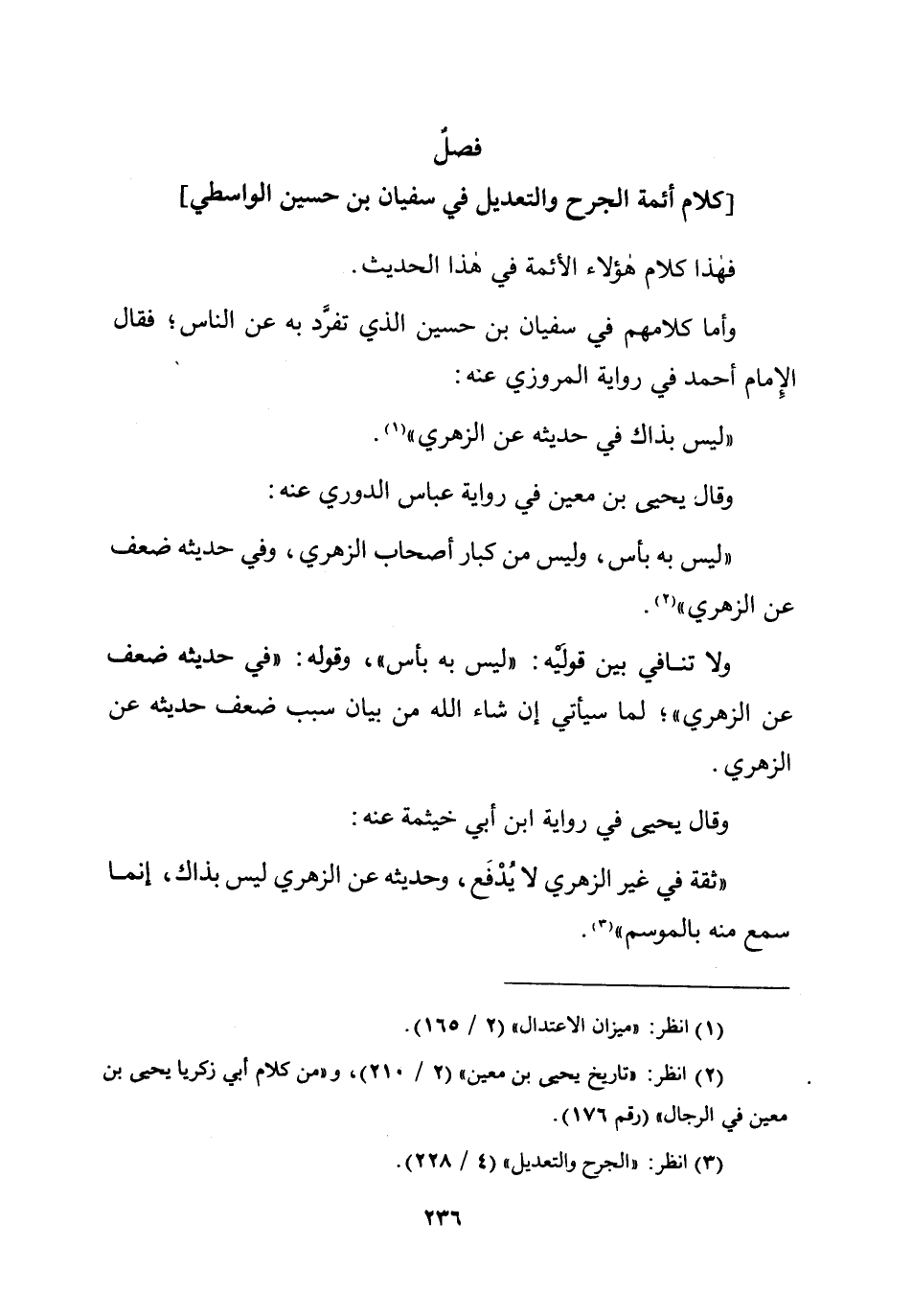 فَهَذَا كَلَام هَؤُلَاءِ الْأَئِمَّة فِي هَذَا الحَدِيث وَأما كَلَامهم فِي سُفْيَان بن حُسَيْن الَّذِي تفرد بِهِ عَن النَّاس فَقَالَ الإِمَام أَحْمد فِي رِوَايَة الْمروزِي عَنهُ لَيْسَ بِذَاكَ فِي حَدِيثه عَن الزُّهْرِيّ