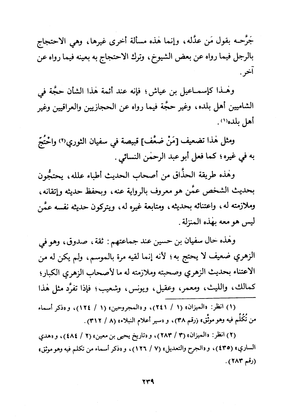 وَهَذِه حَال سُفْيَان بن حُسَيْن عِنْد جَمَاعَتهمْ ثِقَة صَدُوق وَهُوَ فِي الزُّهْرِيّ ضَعِيف لَا يحْتَج بِهِ لِأَنَّهُ إِنَّمَا لقِيه مرّة بِالْمَوْسِمِ وَلم يكن لَهُ من الاعتناء بِحَدِيث الزُّهْرِيّ وصحبته وملازمته لَهُ مَا لأَصْحَاب الزُّهْرِيّ الْكِبَار كمالك وَاللَّيْث وَمعمر وَعقيل وَيُونُس وَشُعَيْب فَإِذا تفرد مثل هَذَا