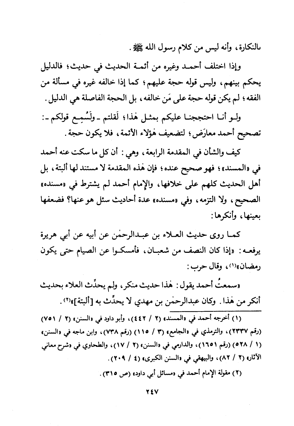 وَإِذا اخْتلف أَحْمد وَغَيره من أَئِمَّة الحَدِيث فِي حَدِيث فالدليل يحكم بَينهم وَلَيْسَ قَوْله حجَّة عَلَيْهِم كَمَا إِذا خَالفه غَيره فِي مَسْأَلَة من الْفِقْه لم يكن قَوْله حجَّة على من خَالفه بل الْحجَّة الفاصلة هِيَ الدَّلِيل
