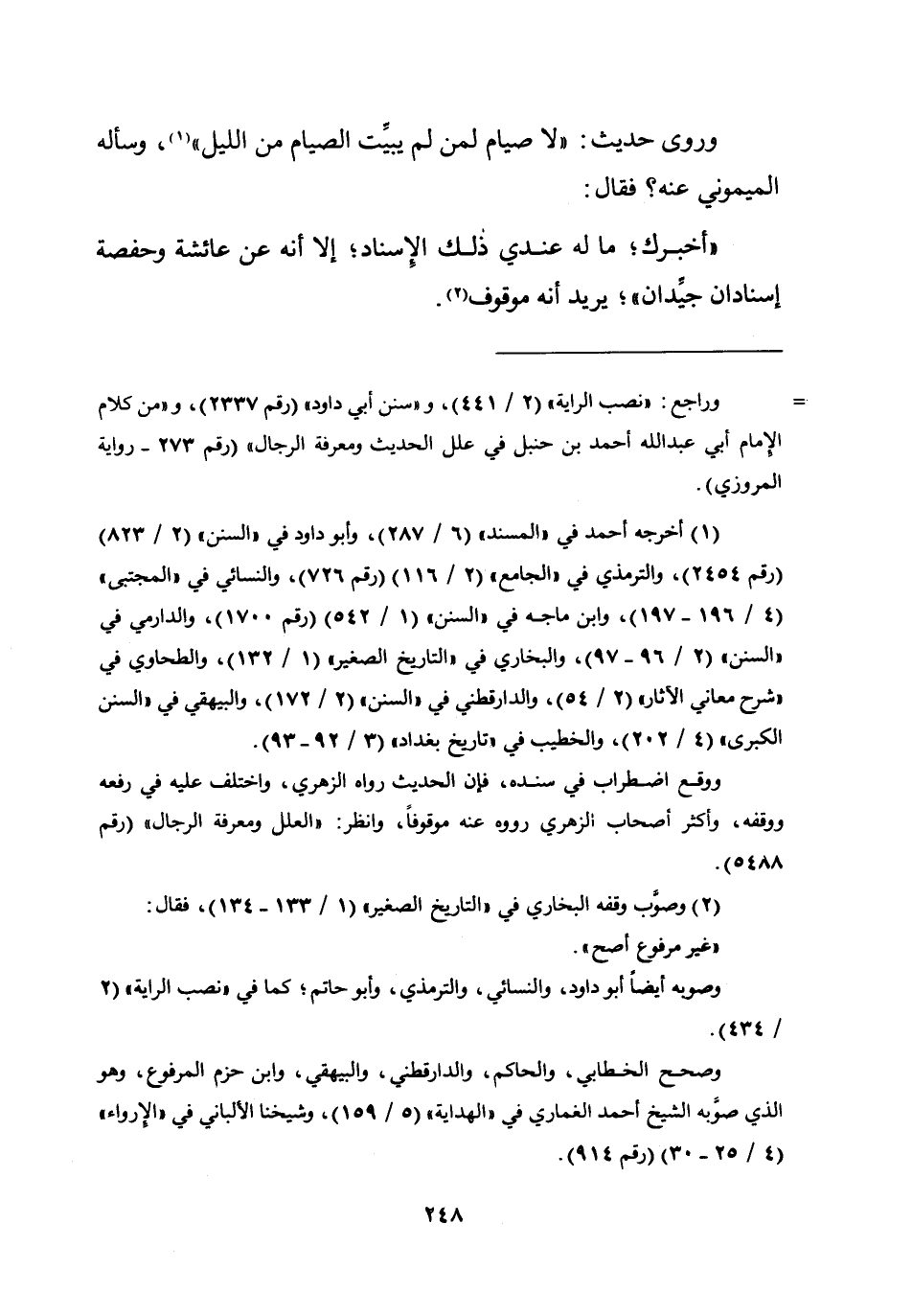 وروى حَدِيث لَا صِيَام لمن لم يبيت الصّيام من اللَّيْل وَسَأَلَهُ الْمَيْمُونِيّ عَنهُ فَقَالَ أخْبرك مَا لَهُ عِنْدِي ذَلِك الْإِسْنَاد إِلَّا أَنه عَن عَائِشَة وَحَفْصَة إسنادان جيدان يُرِيد أَنه مَوْقُوف