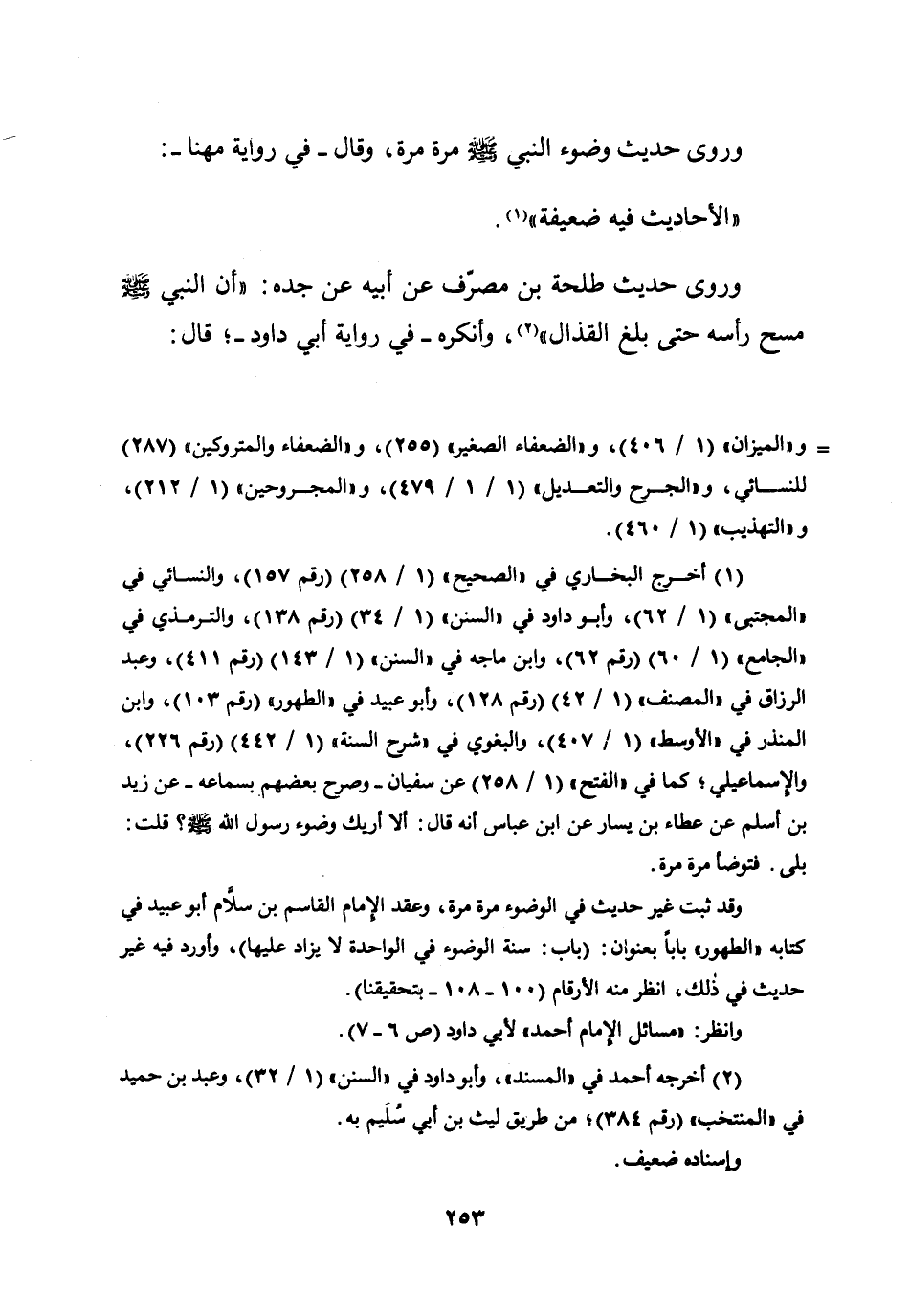 الْأَحَادِيث فِيهِ ضَعِيفَة وروى حَدِيث طَلْحَة بن مصرف عَن أَبِيه عَن جده أَن النَّبِي صلى الله عَلَيْهِ وَسلم مسح رَأسه حَتَّى بلغ القذال وَأنْكرهُ فِي رِوَايَة أبي دَاوُد قَالَ