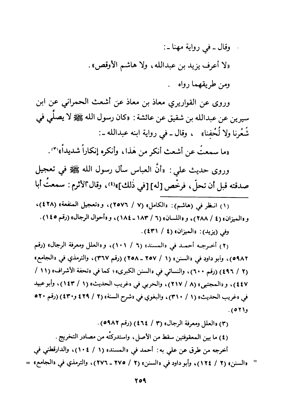 وَقَالَ فِي رِوَايَة مهنا لَا أعرف يزِيد بن عبد الله وَلَا هَاشم الأوقص وَمن طريقهما رَوَاهُ وروى عَن القواريري معَاذ بن معَاذ عَن أشعب الحمراني عَن ابْن سِيرِين عَن عبد الله بن شَقِيق عَن عَائِشَة كَانَ رَسُول الله صلى الله عَلَيْهِ وَسلم لَا يُصَلِّي فِي شعرنَا وَلَا لحفنا وَقَالَ فِي رِوَايَة ابْنه عبد الله مَا سَمِعت عَن أَشْعَث أنكر من هَذَا وَأنْكرهُ إنكارا شَدِيدا وروى حَدِيث عَليّ أَن الْعَبَّاس سَأَلَ رَسُول الله صلى الله عَلَيْهِ وَسلم فِي تَعْجِيل صدقته قبل أَن تحل فَرخص لَهُ فِي ذَلِك وَقَالَ الْأَثْرَم سَمِعت أَبَا