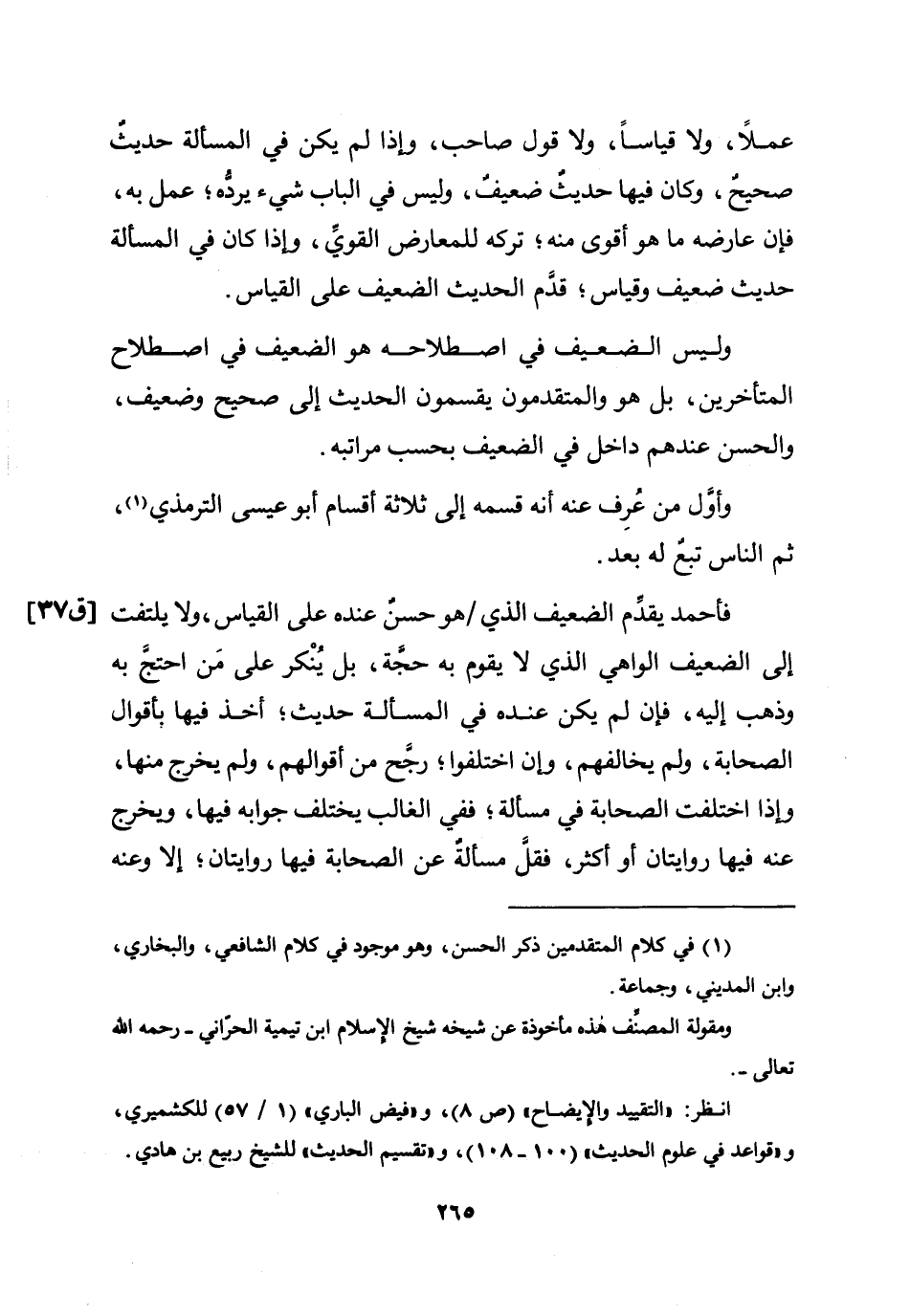 عملا وَلَا قِيَاسا وَلَا قَول صَاحب وَإِذا لم يكن فِي الْمَسْأَلَة حَدِيث صَحِيح وَكَانَ فِيهَا حَدِيث ضَعِيف وَلَيْسَ فِي الْبَاب شئ يردهُ عمل بِهِ فَإِن عَارضه مَا هُوَ أقوى مِنْهُ تَركه للمعارض الْقوي وَإِذا كَانَ فِي الْمَسْأَلَة حَدِيث ضَعِيف وَقِيَاس قدم الحَدِيث الضَّعِيف على الْقيَاس وَلَيْسَ الضَّعِيف فِي اصْطِلَاحه هُوَ الضَّعِيف فِي اصْطِلَاح الْمُتَأَخِّرين بل هُوَ والمتقدمون يقسمون الحَدِيث إِلَى صَحِيح وَضَعِيف وَالْحسن عِنْدهم دَاخل فِي الضَّعِيف بِحَسب مراتبه وَأول من عرف عَنهُ أَنه قسمه إِلَى ثَلَاثَة أَقسَام أَبُو عِيسَى التِّرْمِذِيّ ثمَّ النَّاس تبع لَهُ بعد فَأَحْمَد يقدم الضَّعِيف الَّذِي هُوَ حسن عِنْده على الْقيَاس وَلَا يلْتَفت إِلَى الضَّعِيف الواهي الَّذِي لَا يقوم بِهِ حجَّة بل يُنكر على من احْتج بِهِ وَذهب إِلَيْهِ فَإِن لم يكن عِنْده فِي الْمَسْأَلَة حَدِيث أَخذ فِيهَا بأقوال الصَّحَابَة وَلم يخالفهم وَإِن اخْتلفُوا رجح من أَقْوَالهم وَلم يخرج مِنْهَا وَإِذا اخْتلفت الصَّحَابَة فِي مَسْأَلَة فَفِي الْغَالِب يخْتَلف جَوَابه فِيهَا وَيخرج عَنهُ فِيهَا رِوَايَتَانِ أَو أَكثر فَقل مَسْأَلَة عَن الصَّحَابَة فِيهَا رِوَايَتَانِ إِلَّا وَعنهُ