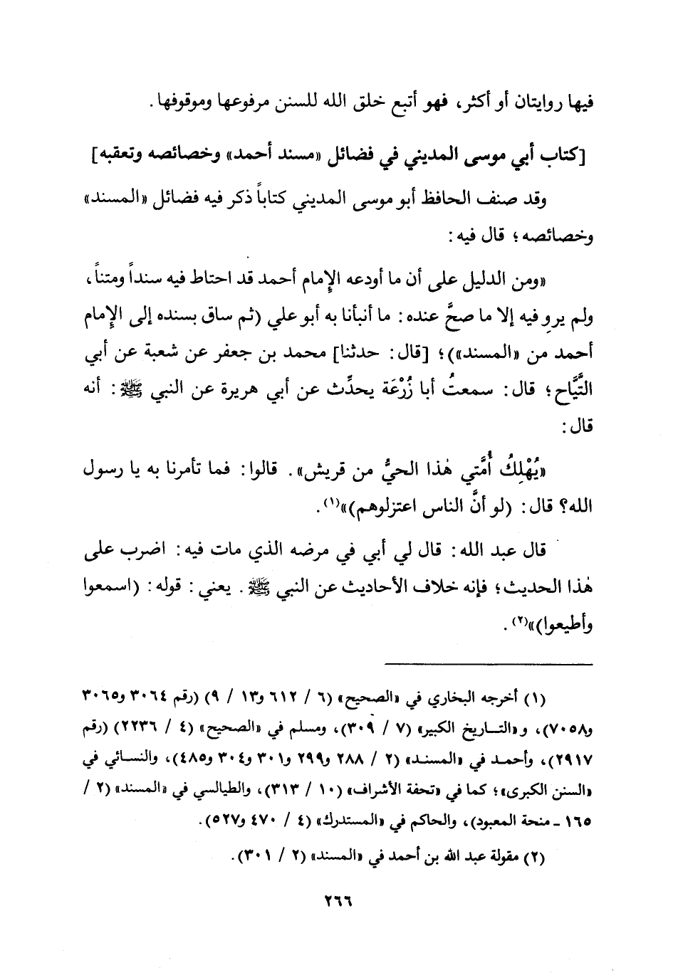 وَقد صنف الْحَافِظ أَبُو مُوسَى الْمَدِينِيّ كتابا ذكر فِيهِ فَضَائِل الْمسند وخصائصه قَالَ فِيهِ وَمن الدَّلِيل على أَن مَا أودعهُ الإِمَام أَحْمد قد احتاط فِيهِ سندا ومتنا وَلم يرو فِيهِ إِلَّا مَا صَحَّ عِنْده مَا أَنبأَنَا بِهِ أَبُو عَليّ ثمَّ سَاق بِسَنَدِهِ إِلَى الإِمَام أَحْمد من الْمسند قَالَ حَدثنَا مُحَمَّد بن جَعْفَر عَن شُعْبَة عَن أبي التياح قَالَ سَمِعت أَبَا زرْعَة يحدث عَن أبي هُرَيْرَة عَن النَّبِي صلى الله عَلَيْهِ وَسلم أَنه قَالَ يهْلك أمتِي هَذَا الْحَيّ من قُرَيْش قَالُوا فَمَا تَأْمُرنَا بِهِ يَا رَسُول الله قَالَ لَو أَن النَّاس اعتزلوهم قَالَ عبد الله قَالَ لي أبي فِي مَرضه الَّذِي مَاتَ فِيهِ اضْرِب على هَذَا فَإِنَّهُ خلاف الْأَحَادِيث عَن النَّبِي صلى الله عَلَيْهِ وَسلم يَعْنِي قَوْله اسمعوا وَأَطيعُوا