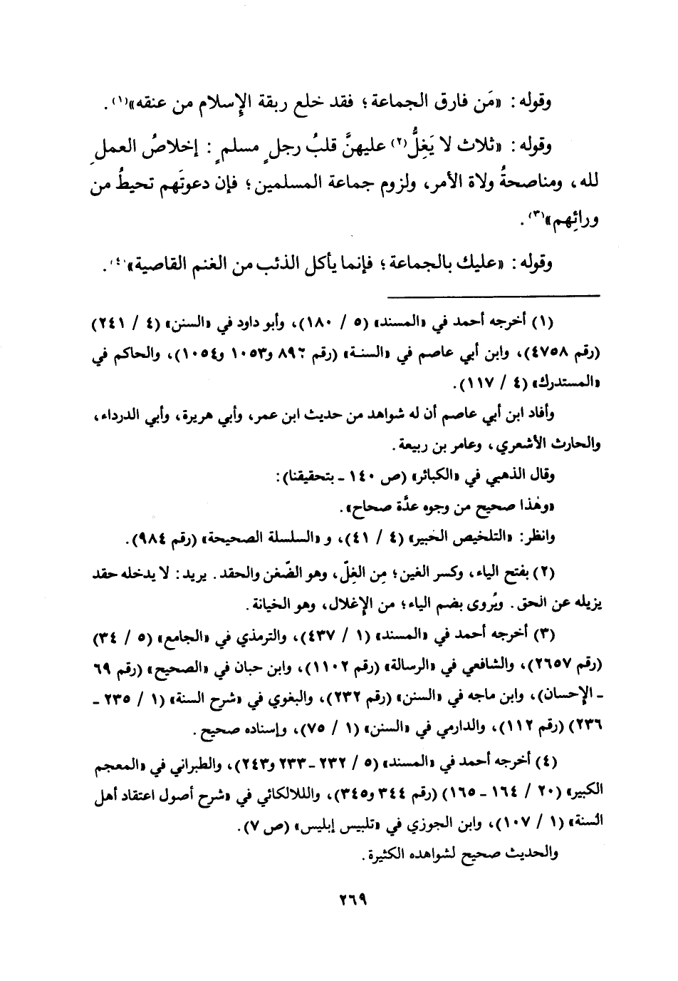 وَقَوله من فَارق الْجَمَاعَة فقد خلع ربقة الْإِسْلَام من عُنُقه وَقَوله ثَلَاث لَا يغل عَلَيْهِنَّ قلب رجل مُسلم إخلاص الْعَمَل لله ومناصحة وُلَاة الْأَمر وَلُزُوم جمَاعَة الْمُسلمين فَإِن دعوتهم تحيط من ورائهم وَقَوله عَلَيْك بِالْجَمَاعَة فَإِنَّمَا يَأْكُل الذِّئْب من الْغنم القاصية