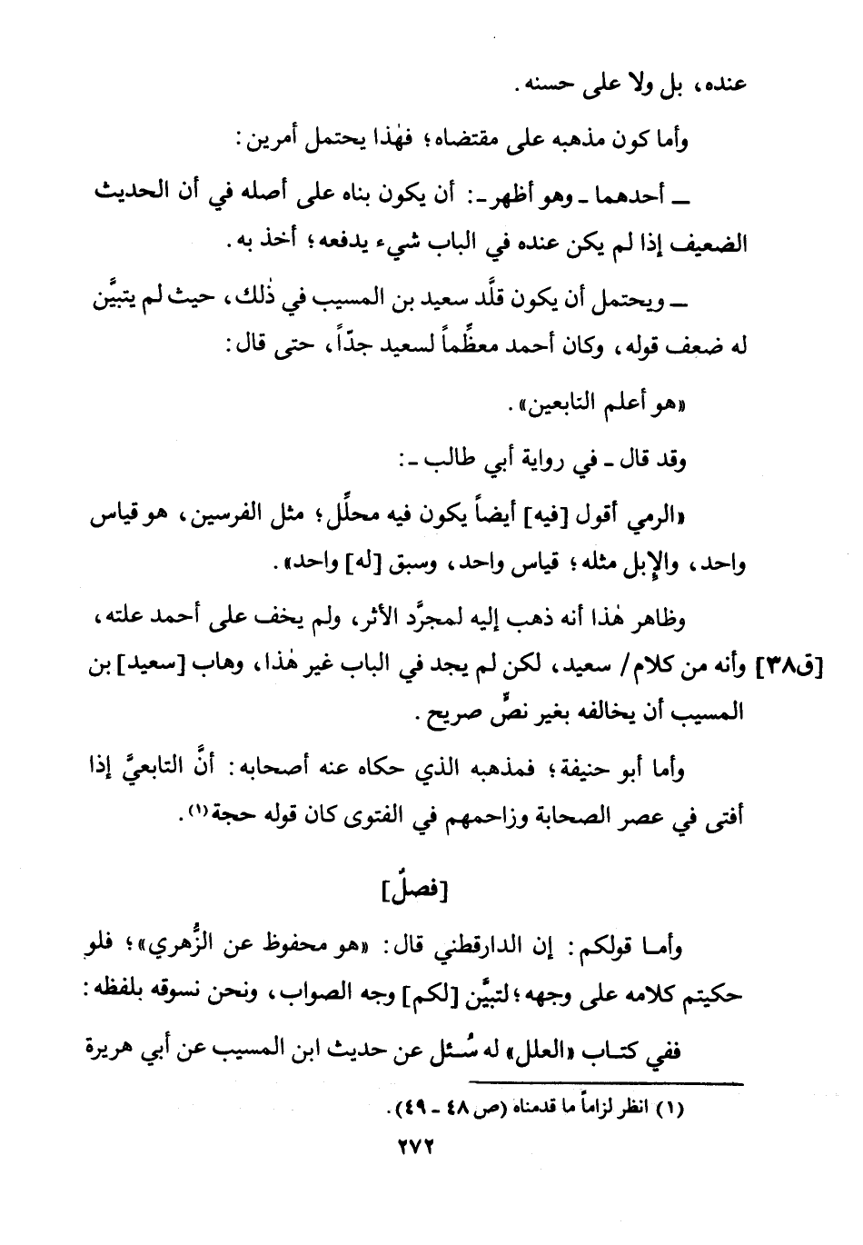 عِنْده بل وَلَا على حسنه وَأما كَون مذْهبه على مُقْتَضَاهُ فَهَذَا يحْتَمل أَمريْن أَحدهمَا وَهُوَ أظهر أَن يكون بناه على أَصله فِي أَن الحَدِيث الضَّعِيف إِذا لم يكن عِنْده فِي الْبَاب شئ يَدْفَعهُ أَخذ بِهِ وَيحْتَمل أَن يكون قلد سعيد بن الْمسيب فِي ذَلِك حَيْثُ لم يتَبَيَّن لَهُ ضعف قَوْله وَكَانَ أَحْمد مُعظما لسَعِيد جدا حَتَّى قَالَ هُوَ أعلم التَّابِعين وَقد قَالَ فِي رِوَايَة أبي طَالب الرَّمْي أَقُول فِيهِ أَيْضا يكون فِيهِ مُحَلل مثل الفرسين هُوَ قِيَاس وَاحِد وَالْإِبِل مثله قِيَاس وَاحِد وَسبق لَهُ وَاحِد وَظَاهر هَذَا أَنه ذهب إِلَيْهِ لمُجَرّد الْأَثر وَلم يخف على أَحْمد علته وَأَنه من كَلَام سعيد لَكِن لم يجد فِي الْبَاب غير هَذَا وهاب سعيد بن الْمسيب أَن يُخَالِفهُ بِغَيْر نَص صَرِيح وَأما أَبُو حنيفَة فمذهبه الَّذِي حَكَاهُ عَنهُ أَصْحَابه أَن التَّابِعِيّ إِذا أفتى فِي عصر الصَّحَابَة وزاحمهم فِي الْفَتْوَى كَانَ قَوْله حجَّة
