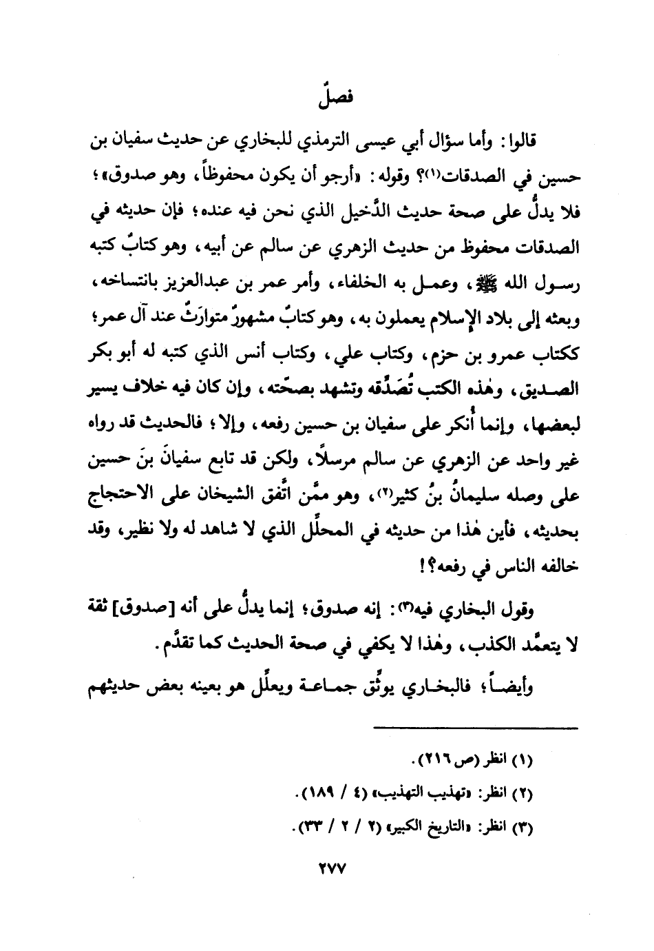 قَالُوا وَأما سُؤال أبي عِيسَى التِّرْمِذِيّ للْبُخَارِيّ عَن حَدِيث سُفْيَان بن حُسَيْن فِي الصَّدقَات وَقَوله أَرْجُو أَن يكون مَحْفُوظًا وَهُوَ صَدُوق فَلَا يدل على صِحَة حَدِيث الدخيل الَّذِي نَحن فِيهِ عِنْده فَإِن حَدِيثه فِي الصَّدقَات مَحْفُوظ من حَدِيث الزُّهْرِيّ عَن سَالم عَن أَبِيه وَهُوَ كتاب كتبه رَسُول الله صلى الله عَلَيْهِ وَسلم وَعمل بِهِ الْخُلَفَاء وَأمر عمر بن عبد الْعَزِيز بانتساخه وَبَعثه إِلَى بِلَاد الْإِسْلَام يعْملُونَ بِهِ وَهُوَ كتاب مَشْهُور متوارث عِنْد آل عمر ككتاب عَمْرو بن حزم وَكتاب عَليّ وَكتاب أنس الَّذِي كتبه لَهُ أَبُو بكر الصّديق وَهَذَا الْكتب تصدقه وَتشهد بِصِحَّتِهِ وَإِن كَانَ فِيهِ خلاف يسير لبعضها وَإِنَّمَا أنكر على سُفْيَان بن حُسَيْن رَفعه وَإِلَّا فَالْحَدِيث قد رَوَاهُ غير وَاحِد عَن الزُّهْرِيّ عَن سَالم مُرْسلا وَلَكِن قد تَابع سُفْيَان بن حُسَيْن على وَصله سُلَيْمَان بن كثير وَهُوَ مِمَّن اتّفق الشَّيْخَانِ على الِاحْتِجَاج بحَديثه فَأَيْنَ هَذَا من حَدِيثه فِي الْمُحَلّل الَّذِي لَا شَاهد لَهُ وَلَا نَظِير وَقد خَالفه النَّاس فِي رَفعه