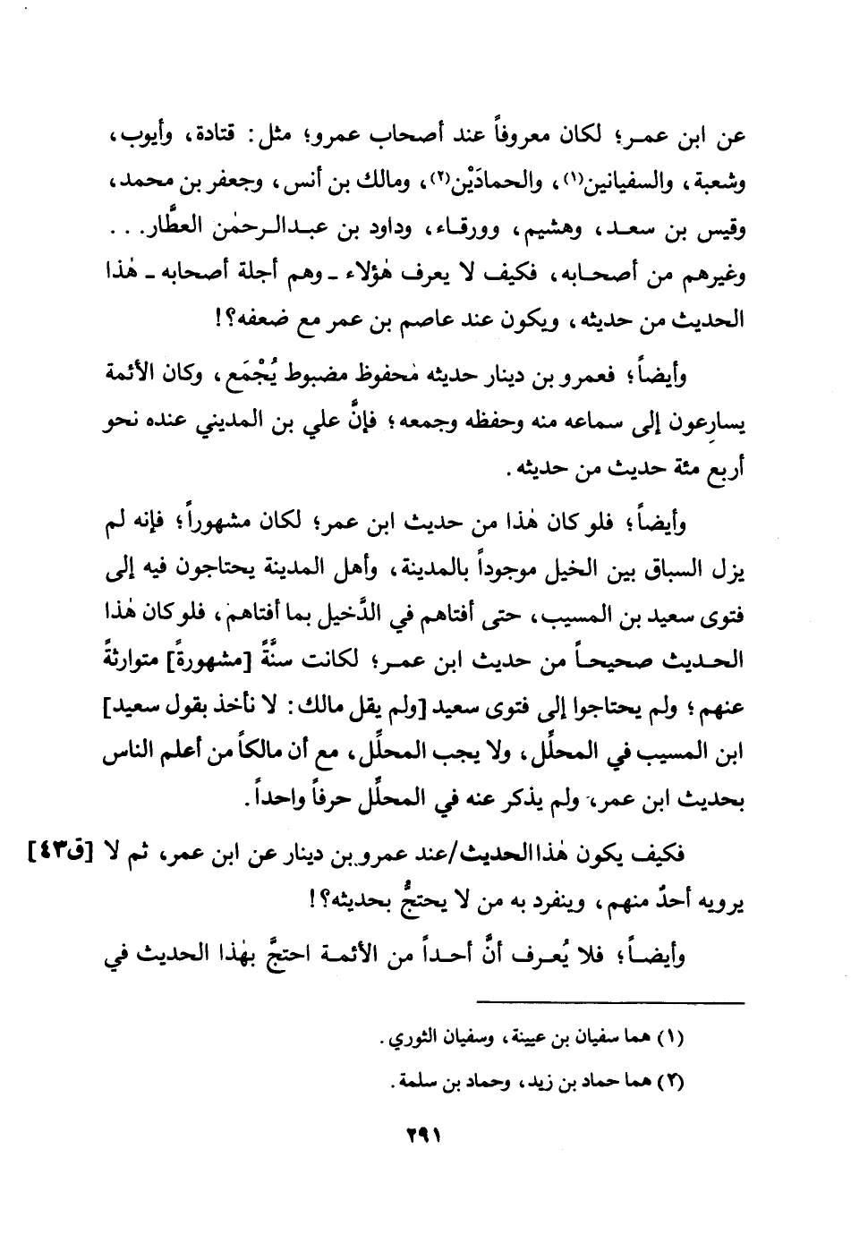 عَن ابْن عمر لَكَانَ مَعْرُوفا عِنْد اصحاب عَمْرو مثل قَتَادَة وَأَيوب وَشعْبَة والسفيانين والحمادين وَمَالك بن أنس وجعفر بن مُحَمَّد وَقيس بن سعد وهشيم وورقاء وَدَاوُد بن عبد الرَّحْمَن الْعَطَّار وَغَيرهم من أَصْحَابه فَكيف لَا يعرف هَؤُلَاءِ وهم أجلة أَصْحَابه هَذَا الحَدِيث من حَدِيثه وَيكون عِنْد عَاصِم بن عمر مَعَ ضعفه