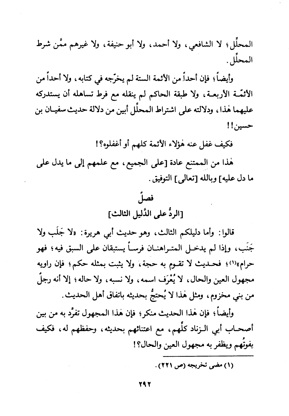الْمُحَلّل لَا الشَّافِعِي وَلَا أَحْمد وَلَا أَبُو حنيفَة وَلَا غَيرهم مِمَّن شَرط الْمُحَلّل وَأَيْضًا فَإِن أحدا من الْأَئِمَّة السِّتَّة لم يُخرجهُ فِي كِتَابه وَلَا أحد من الْأَئِمَّة الْأَرْبَعَة وَلَا طبقَة الْحَاكِم لم يَنْقُلهُ مَعَ فرط تساهله أَن يَسْتَدْرِكهُ عَلَيْهِمَا هَذَا ودلالته على اشْتِرَاط الْمُحَلّل أبين من دلَالَة حَدِيث سُفْيَان بن حُسَيْن فَكيف غفل عَنهُ هَؤُلَاءِ الْأَئِمَّة كلهم أَو أغفلوه هَذَا من الْمُمْتَنع عَادَة على الْجَمِيع مَعَ علمهمْ إِلَى مَا يدل على مَا دلّ عَلَيْهِ وَبِاللَّهِ تَعَالَى التَّوْفِيق