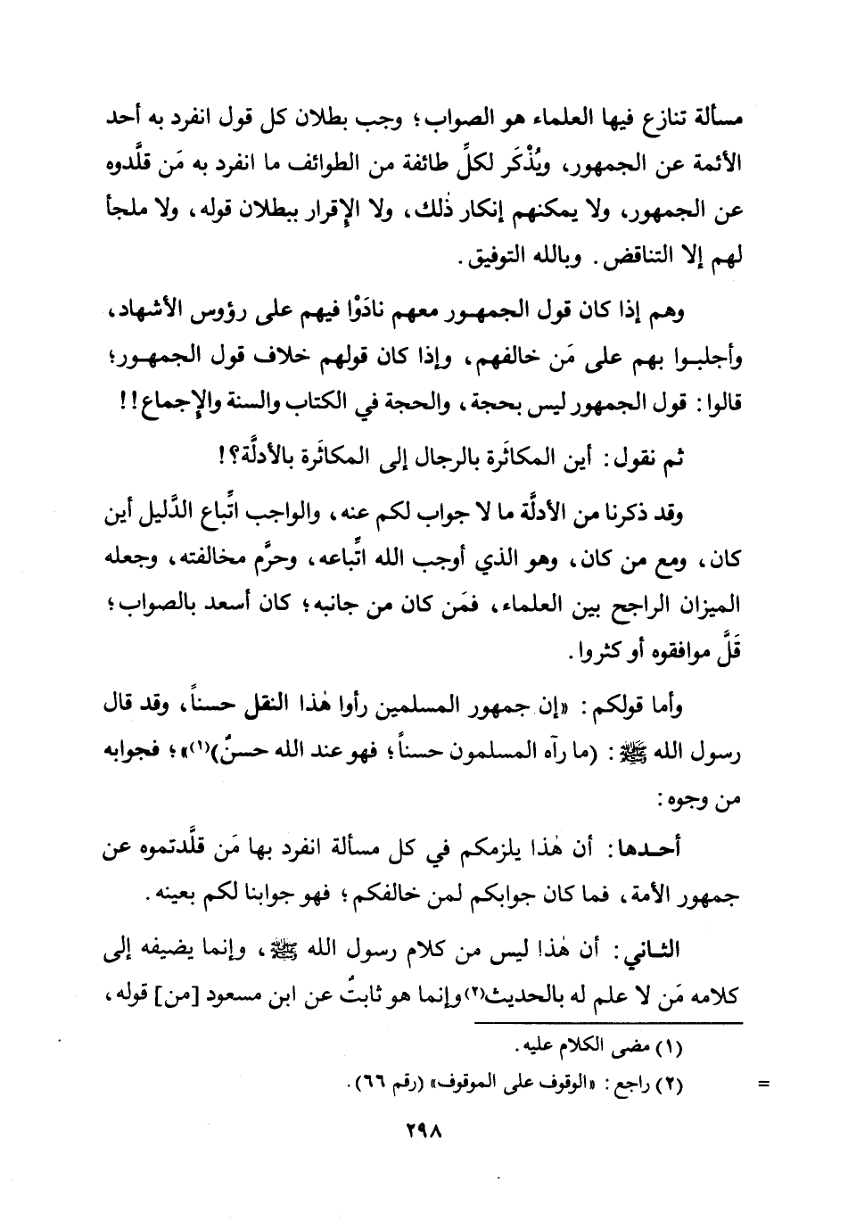 مَسْأَلَة تنَازع فِيهَا الْعلمَاء هُوَ الصَّوَاب وَجب بطلَان كل قَول انْفَرد بِهِ أحد الْأَئِمَّة عَن الْجُمْهُور وَيذكر لكل طَائِفَة من الطوائف مَا انْفَرد بِهِ من قلدوه عَن الْجُمْهُور وَلَا يُمكنهُم إِنْكَار ذَلِك وَلَا الْإِقْرَار بِبُطْلَان قَوْله وَلَا ملْجأ لَهُم إِلَّا التَّنَاقُض وَبِاللَّهِ التَّوْفِيق وهم إِذا كَانَ قَول الْجُمْهُور مَعَهم نادوا فيهم على رُؤُوس الأشهاد وأجلبوا بهم على من خالفهم وَإِذا كَانَ قَوْلهم خلاف قَول الْجُمْهُور قَالُوا قَول الْجُمْهُور لَيْسَ بِحجَّة وَالْحجّة فِي الْكتاب وَالسّنة وَالْإِجْمَاع ثمَّ نقُول أَيْن المكاثرة بِالرِّجَالِ إِلَى المكاثرة بالأدلة وَقد ذكرنَا من الْأَدِلَّة مَا لَا جَوَاب لكم عَنهُ وَالْوَاجِب اتِّبَاع الدَّلِيل أَيْن كَانَ وَمَعَ من كَانَ وَهُوَ الَّذِي أوجب الله اتِّبَاعه وَحرم مُخَالفَته وَجعله الْمِيزَان الرَّاجِح بَين الْعلمَاء فَمن كَانَ من جَانِبه كَانَ أسعد بِالصَّوَابِ قل موافقوه أَو كَثُرُوا وَأما قَوْلكُم إِن جُمْهُور الْمُسلمين رَأَوْا هَذَا النَّقْل حسنا وَقد قَالَ رَسُول الله صلى الله عَلَيْهِ وَسلم مَا رَآهُ الْمُسلمُونَ حسنا فَهُوَ عِنْد الله حسن فَجَوَابه من وُجُوه