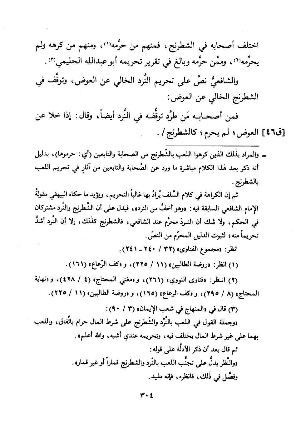 اخْتلف أَصْحَابه فِي الشطرنج فَمنهمْ من حرمه وَمِنْهُم من كرهه وَلم يحرمه وَمِمَّنْ حرمه وَبَالغ فِي تَقْرِير تَحْرِيمه أَبُو عبد الله الْحَلِيمِيّ وَالشَّافِعِيّ نَص على تَحْرِيم النَّرْد الْخَالِي عَن الْعِوَض وَتوقف فِي الشطرنج الْخَالِي عَن الْعِوَض فَمن أَصْحَابه من طرد توقفه فِي النَّرْد أَيْضا وَقَالَ إِذا خلا عَن الْعِوَض لم يحرم كالشطرنج