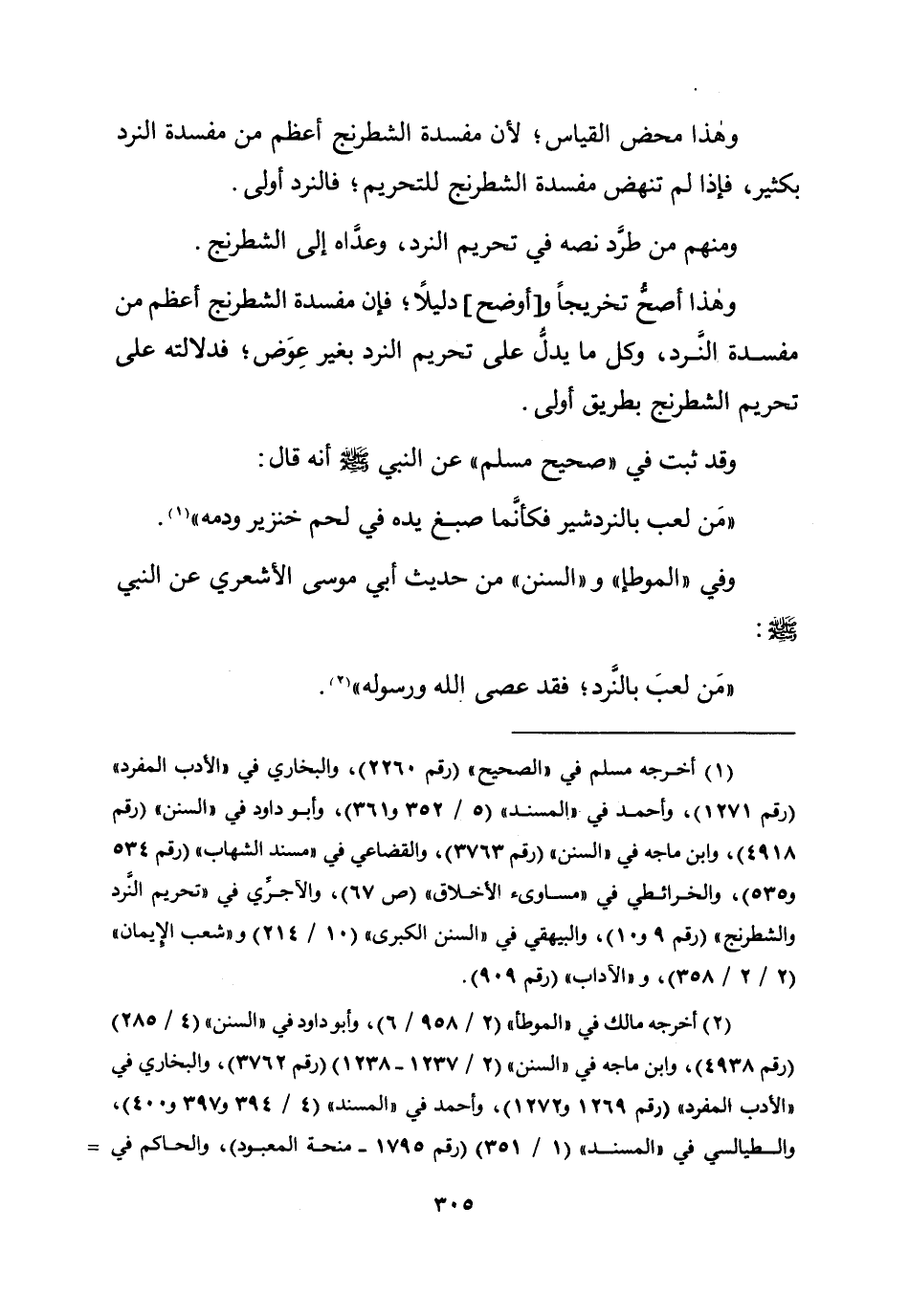 وَهَذَا مَحْض الْقيَاس لِأَن مفْسدَة الشطرنج أعظم من مفْسدَة النَّرْد بِكَثِير فَإِذا لم تنهض مفْسدَة الشطرنج للتَّحْرِيم فالنرد أولى وَمِنْهُم من طرد نَصه فِي تَحْرِيم النَّرْد وعداه إِلَى الشطرنج وَهَذَا أصح تخريجا وأوضح دَلِيلا فَإِن مفْسدَة الشطرنج أعظم من مفْسدَة النَّرْد وكل مَا يدل على تَحْرِيم النَّرْد بِغَيْر عوض فدلالته على تَحْرِيم الشطرنج بطرِيق أولى وَقد ثَبت فِي صَحِيح مُسلم عَن النَّبِي صلى الله عَلَيْهِ وَسلم أَنه قَالَ من لعب بالنردشير فَكَأَنَّمَا صبغ يَده فِي لحم خِنْزِير وَدَمه وَفِي الْمُوَطَّأ وَالسّنَن من حَدِيث أبي مُوسَى الْأَشْعَرِيّ عَن النَّبِي صلى الله عَلَيْهِ وَسلم من لعب بالنرد فقد عصى الله وَرَسُوله