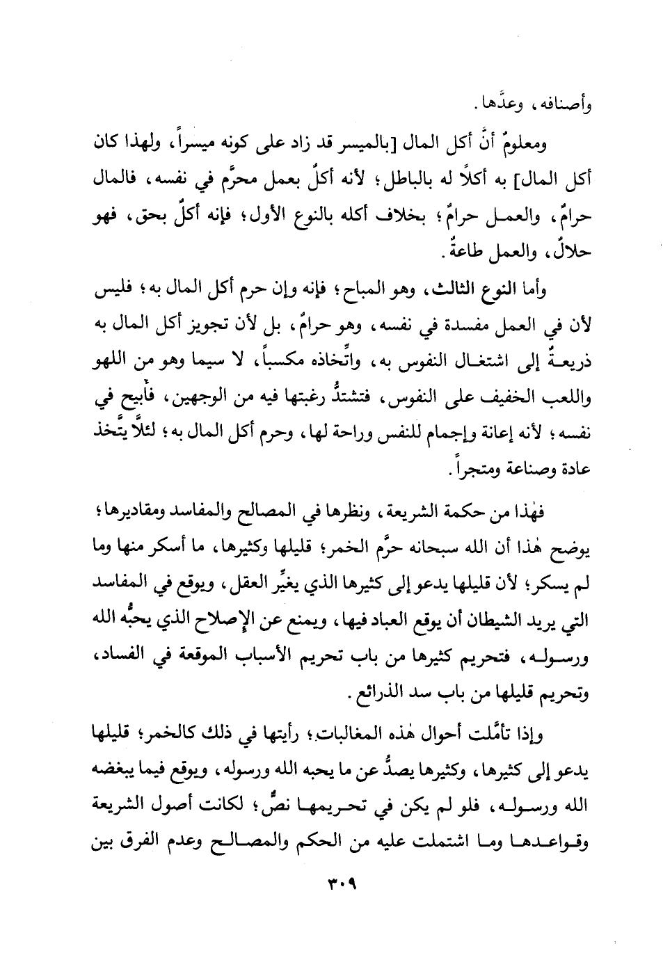 وأصنافه وعدها وَمَعْلُوم أَن أكل المَال بالميسر قد زَاد على كَونه ميسرًا وَلِهَذَا كَانَ أكل المَال بِهِ اكلا بِهِ بِالْبَاطِلِ لِأَنَّهُ أكل بِعَمَل محرم فِي نَفسه فَالْمَال حرَام وَالْعَمَل حرَام بِخِلَاف أكله بالنوع الأول فَإِنَّهُ كل بِحَق فَهُوَ حَلَال وَالْعَمَل طَاعَة وَأما النَّوْع الثَّالِث وَهُوَ الْمُبَاح فَإِنَّهُ وَإِن حرم أكل المَال بِهِ فَلَيْسَ لِأَن فِي الْعلم مفْسدَة فِي نَفسه وَهُوَ حرَام بل لِأَن تَجْوِيز أكل المَال بِهِ ذَرِيعَة إِلَى اشْتِغَال النُّفُوس بِهِ واتخاذه مكسبا لَا سِيمَا وَهُوَ من اللَّهْو واللعب الْخَفِيف على النُّفُوس فتشتد رغبتها فِيهِ من الْوَجْهَيْنِ فأبيح فِي نَفسه لِأَنَّهُ إِعَانَة وإجمام للنَّفس وراحة لَهَا وَحرم أكل المَال بِهِ لِئَلَّا يتَّخذ عَادَة وصناعة ومتجرا فَهَذَا من حِكْمَة الشَّرِيعَة ونظرها فِي الْمصَالح والمفاسد ومقاديرها يُوضح هَذَا أَن الله سُبْحَانَهُ حرم الْخمر قليلها وكثيرها مَا أسكر مِنْهَا وَمنا لم يسكر لِأَن قليلها يَدْعُو إِلَى كثيرها الَّذِي يُغير الْعقل ويوقع فِي الْمَفَاسِد الَّتِي يُرِيد الشَّيْطَان أَن يُوقع الْعباد فِيهَا وَيمْنَع عَن الْإِصْلَاح الَّذِي يُحِبهُ الله وَرَسُوله فتحريم كثيرها من بَاب تَحْرِيم الْأَسْبَاب الموقعة فِي الْفساد وَتَحْرِيم قليلها من بَاب سد الذرائع وَإِذا تَأَمَّلت أَحْوَال هَذِه المغالبات رَأَيْتهَا فِي ذَلِك كَالْخمرِ قليلها يَدْعُو إِلَى كثيرها وكثيرها يصد عَن مَا يُحِبهُ الله وَرَسُوله ويوقع فِيمَا يبغضه الله وَرَسُوله فَلَو لم يكن فِي تَحْرِيمهَا نَص لكَانَتْ أصُول الشَّرِيعَة وقواعدها وَمَا اشْتَمَلت عَلَيْهِ من الحكم والمصالح وَعدم الْفرق بَين
