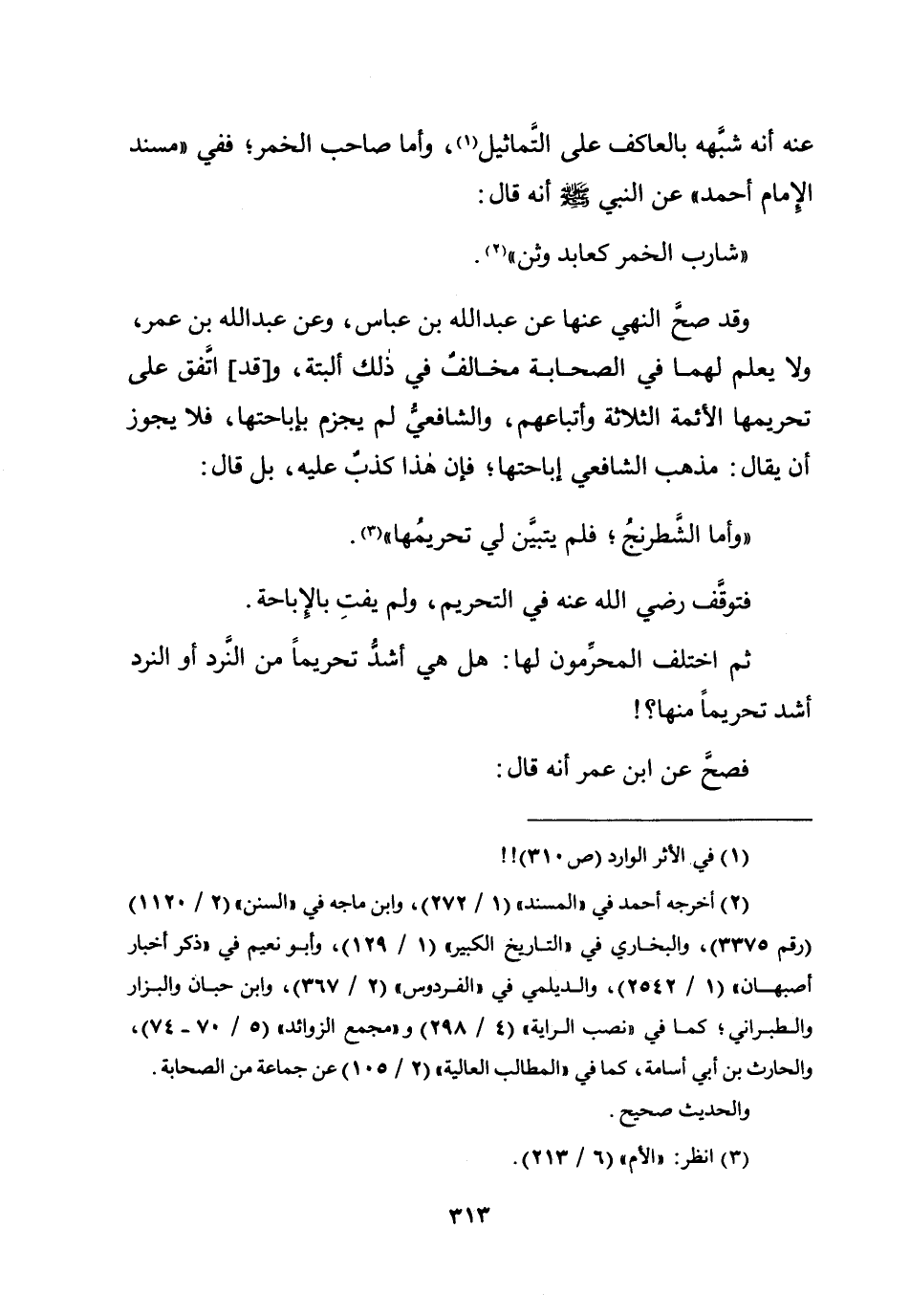 عَنهُ أَنه شبهه بالعاكف على التماثيل وَأما صَاحب الْخمر فَفِي مُسْند الإِمَام أَحْمد عَن النَّبِي صلى الله عَلَيْهِ وَسلم أَنه قَالَ شَارِب الْخمر كعابد وثن وَقد صَحَّ النَّهْي عَنْهَا عَن عبد الله بن عَبَّاس وَعَن عبد الله بن عمر وَلَا يعلم لَهما فِي الصَّحَابَة مُخَالف فِي ذَلِك ألبته وَقد اتّفق على تَحْرِيمهَا الْأَئِمَّة الثَّلَاثَة وأتباعهم وَالشَّافِعِيّ لم يجْزم بإباحتها فَلَا يجوز أَن يُقَال مَذْهَب الشَّافِعِي إباحتها فَإِن هَذَا كذب عَلَيْهِ بل قَالَ وَأما الشطرنج فَلم يتَبَيَّن لي تَحْرِيمهَا فتوقف رَضِي الله عَنهُ فِي التَّحْرِيم وَلم يفت بِالْإِبَاحَةِ ثمَّ اخْتلف المحرمون لَهَا هَل هِيَ أَشد تَحْرِيمًا من النَّرْد أَو النَّرْد أَشد تَحْرِيمًا مِنْهَا فصح عَن ابْن عمر أَنه قَالَ