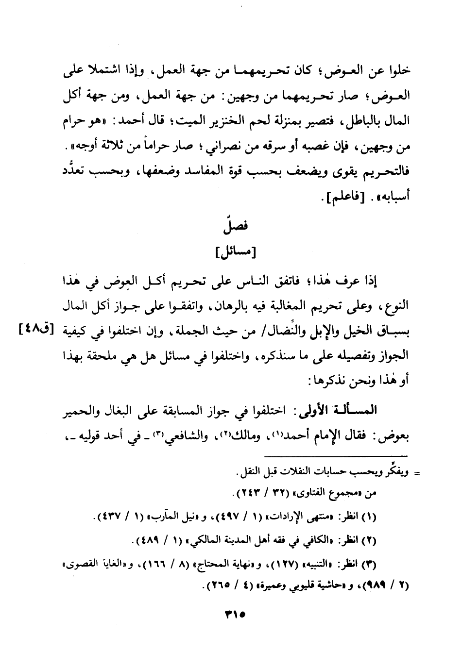 [مسَائِل] إِذا عرف هَذَا فاتفق النَّاس على تَحْرِيم أكل الْعِوَض فِي هَذَا النَّوْع وعَلى تَحْرِيم المغالبة فِيهِ بالرهان وَاتَّفَقُوا على جَوَاز أكل المَال بسباق الْخَيل وَالْإِبِل والنضال من حَيْثُ الْجُمْلَة وَإِن اخْتلفُوا فِي كَيْفيَّة الْجَوَاز وتفصيله على مَا سَنذكرُهُ وَاخْتلفُوا فِي مسَائِل هَل هِيَ مُلْحقَة بِهَذَا أَو هَذَا وَنحن نذكرها الْمَسْأَلَة الأولى اخْتلفُوا فِي جَوَاز الْمُسَابقَة على البغال وَالْحمير بعوض فَقَالَ الإِمَام أَحْمد وَمَالك وَالشَّافِعِيّ فِي أحد قوليه