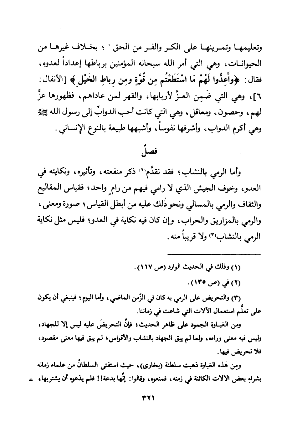 وَأما الرَّمْي بالنشاب فقد تقدم ذكر منفعَته وتأثيره ونكايته فِي الْعَدو وَخَوف الْجَيْش الَّذِي لَا رامي فيهم من رام وَاحِد فَقِيَاس المقاليع والثقاف وَالرَّمْي بالمسالي وَنَحْو ذَلِك عَلَيْهِ من أبطل الْقيَاس صُورَة وَمعنى وَالرَّمْي بالمزاريق والحراب وَإِن كَانَ فِيهِ نكاية فِي الْعَدو فَلَيْسَ مثل نكاية الرَّمْي بالنشاب وَلَا قَرِيبا مِنْهُ