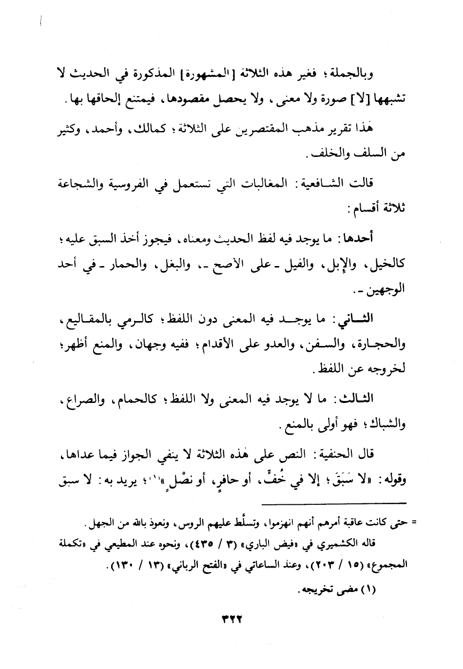 وَبِالْجُمْلَةِ فَغير هَذِه الثَّلَاثَة الْمَشْهُورَة الْمَذْكُورَة فِي الحَدِيث لَا تشبهها لَا صُورَة وَلَا معنى وَلَا يحصل مقصودها فَيمْتَنع إلحاقها بهَا هَذَا تَقْرِير مَذْهَب المقتصرين على الثَّلَاثَة كمالك وَأحمد وَكثير من السّلف وَالْخلف قَالَت الشَّافِعِيَّة المغالبات الَّتِي تسْتَعْمل فِي الفروسية والشجاعة ثَلَاثَة أَقسَام أَحدهَا مَا يُوجد فِيهِ لفظ الحَدِيث وَمَعْنَاهُ فَيجوز أَخذ السَّبق عَلَيْهِ كالخيل وَالْإِبِل والفيل على الْأَصَح والبغل وَالْحمار فِي أحد الْوَجْهَيْنِ الثَّانِي مَا يُوجد فِيهِ الْمَعْنى دون اللَّفْظ كالرمي بالمقاليع وَالْحِجَارَة والسفن والعدو على الْأَقْدَام فَفِيهِ وَجْهَان وَالْمَنْع أظهر لِخُرُوجِهِ عَن اللَّفْظ الثَّالِث مَا لَا يُوجد فِيهِ الْمَعْنى وَلَا اللَّفْظ كالحمام والصراع والشباك فَهُوَ أولى بِالْمَنْعِ قَالَ الْحَنَفِيّ النَّص على هَذِه الثَّلَاثَة لَا يَنْفِي الْجَوَاز فِيمَا عَداهَا وَقَوله لَا سبق إِلَّا فِي خف أَو حافر أَو نصل يُرِيد بِهِ لَا سبق