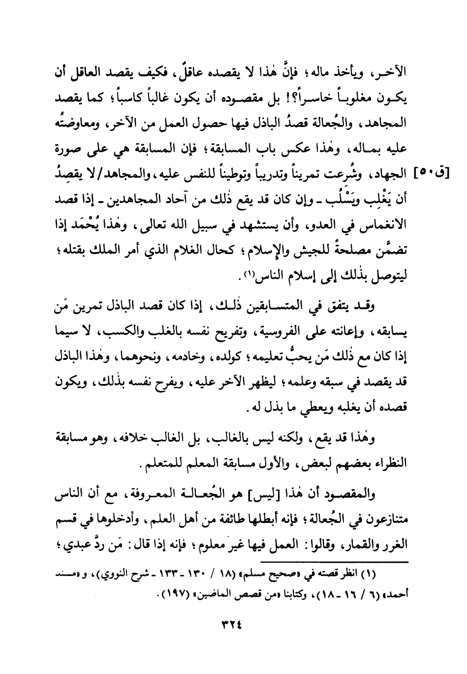 الآخر وَيَأْخُذ مَاله فَإِن هَذَا لَا يَقْصِدهُ عَاقل فَكيف يقْصد الْعَاقِل أَن يكون مَغْلُوبًا خاسرا بل مَقْصُوده أَن يكون غَالِبا كاسبا كَمَا يقْصد الْمُجَاهِد والجعالة قصد الْبَاذِل فِيهَا حُصُول الْعَمَل من الآخر ومعاوضته عَلَيْهِ بِمَالِه وَهَذَا عكس بَاب الْمُسَابقَة فَإِن الْمُسَابقَة هِيَ عَليّ صُورَة الْجِهَاد وشرعت تموينا وتدريبا وتوطينا للنَّفس عَلَيْهِ والمجاهد لَا يقْصد أَن يغلب ويسلب وَإِن كَانَ قد يَقع ذَلِك من آحَاد الْمُجَاهدين إِذا قصد الانغماس فِي الْعَدو وَأَن يستشهد فِي سَبِيل الله تَعَالَى وَهَذَا يحمد إِذا تضمن مصلحَة للجيش وَالْإِسْلَام كَحال الْغُلَام الَّذِي أَمر الْملك بقتْله ليتوصل بذلك إِلَى إِسْلَام النَّاس