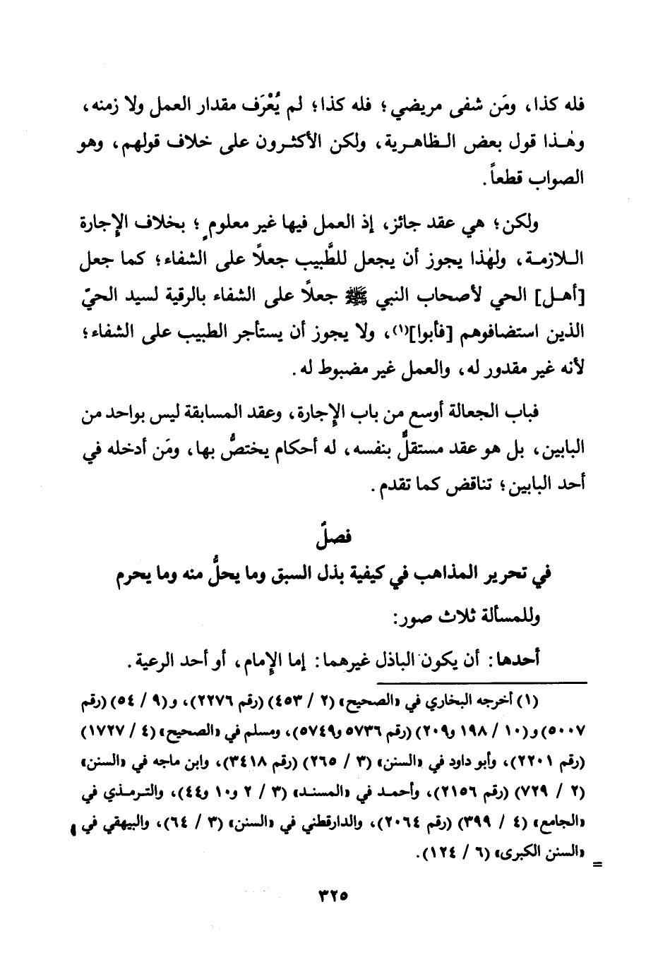 فِي تَحْرِير الْمذَاهب فِي كَيْفيَّة بذل السَّبق وَمَا يحل مِنْهُ وَمَا يحرم وللمسألة ثَلَاث صور أَحدهَا أَن يكون الْبَاذِل غَيرهمَا إِمَّا الإِمَام أَو أحد الرّعية