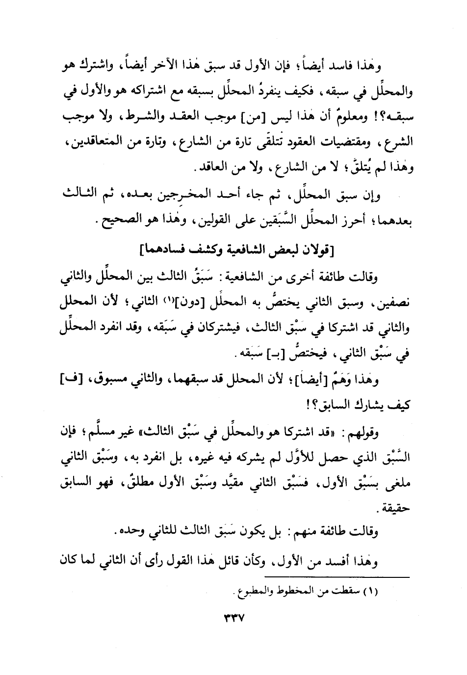 وَهَذَا فَاسد ايضا فَإِن الأول قد سبق هَذَا الآخر ايضا واشترك هُوَ والمحلل فِي سبقه فَكيف ينْفَرد الْمُحَلّل بسبقه مَعَ اشتراكه هُوَ وَالْأول فِي سبقه وَمَعْلُوم أَن هَذَا لَيْسَ (من) مُوجب العقد وَالشّرط وَلَا مُوجب الشَّرْع ومقتضيات الْعُقُود تتلقى تَارَة من الشَّارِع وَتارَة من الْمُتَعَاقدين وَهَذَا لم يتلق لَا من الشَّارِع وَلَا من الْعَاقِد وَإِن سبق الْمُحَلّل ثمَّ جَاءَ أحد المخرجين بعده ثمَّ الثَّالِث بعدهمَا أحرز الْمُحَلّل السبقين على الْقَوْلَيْنِ وَهَذَا هوا الصَّحِيح (قَولَانِ لبَعض الشَّافِعِيَّة وكشف فسادهما) وَقَالَت طَائِفَة أُخْرَى من الشَّافِعِيَّة سبق الثَّالِث بَين الْمُحَلّل وَالثَّانِي نِصْفَيْنِ وَسبق الثَّانِي يخْتَص بِهِ الْمُحَلّل (دون) الثَّانِي لِأَن الْمُحَلّل وَالثَّانِي قد اشْتَركَا فِي سبق الثَّالِث فيشتركان فِي سبقه وَقد انْفَرد الْمُحَلّل فِي سبق الثَّانِي فَيخْتَص (ب) سبقه وَهَذَا وهم (أَيْضا) لِأَن الْمُحَلّل قد سبقهما وَالثَّانِي مَسْبُوق (ف) كَيفَ يُشَارك السَّابِق وَقَوْلهمْ قد اشْتَركَا هُوَ والمحلل فِي سبق الثَّالِث غير مُسلم فَإِن السَّبق الَّذِي حصل للْأولِ لم يشركهُ فِيهِ غَيره بل انْفَرد بِهِ وَسبق الثَّانِي ملغي بسبق الأول فَسبق الثَّانِي مُقَيّد الأول مُطلق فَهُوَ السَّابِق حَقِيقَة وَقَالَت طَائِفَة مِنْهُم بل يكون سبق الثَّالِث للثَّانِي وَحده