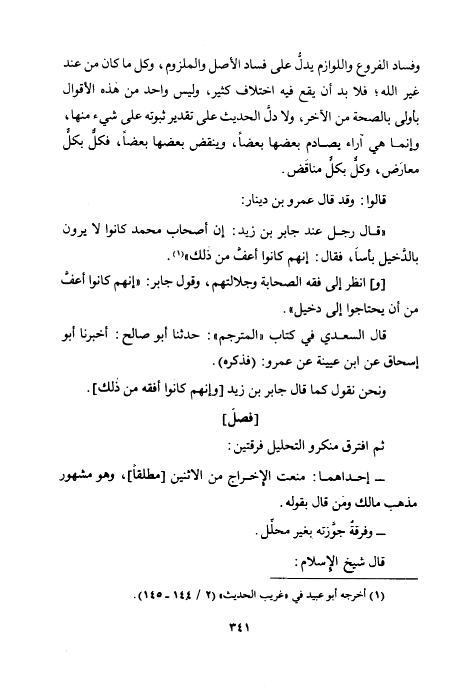 وَفَسَاد الْفُرُوع واللوازم يدل على فَسَاد الأَصْل والملزوم وكل مَا كَانَت من عِنْد غير الله فَلَا بُد أَن يَقع فِيهِ اخْتِلَاف كثير وَلَيْسَ وَاحِد من هَذِه الْأَقْوَال بِأولى بِالصِّحَّةِ من الآخر وَلَا دلّ الحَدِيث على تَقْدِير ثُبُوته على شَيْء مِنْهَا وَإِنَّمَا هِيَ آراء يصادم بَعْضهَا بَعْضًا وينقض بَعْضهَا بَعْضًا فَكل بِكُل معَارض ووكل بِكُل مُنَاقض قَالُوا وَقد قَالَ عَمْرو بن دِينَار قَالَ رجل عِنْد جَابر بن زيد إِن أَصْحَاب مُحَمَّد كَانُوا لَا يرَوْنَ بالدخيل بَأْسا فَقَالَ إِنَّهُم كَانُوا أعف من ذَلِك (و) انْظُر إِلَى فقه الصَّحَابَة وجلالتهم وَقَول جَابر إِنَّهُم كَانُوا أعف من أَن يحتاجوا إِلَى دخيل قَالَ السَّعْدِيّ فِي كتاب المترجم حَدثنَا أَبُو صَالح أخبرنَا أَبُو إِسْحَاق عَن ابْن عُيَيْنَة عَن عمْرَة (فَذكره) وَنحن نقُول كَمَا قَالَ جَابر بن زيد (وَإِنَّهُم كَانُوا أفقه من ذَلِك)