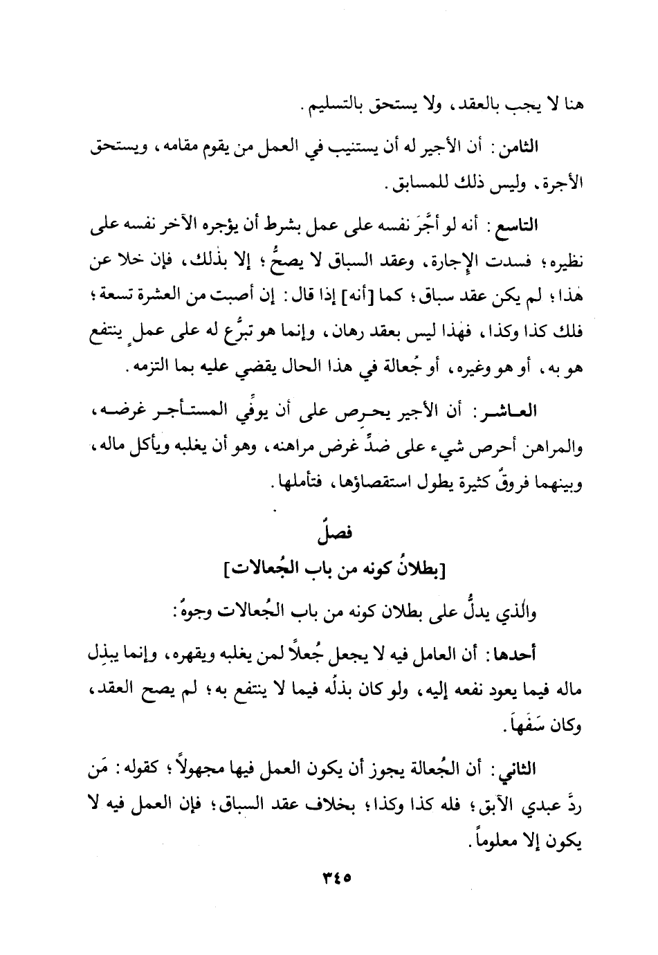 وَالَّذِي يدل على بطلَان كَونه من بَاب الجعالات وُجُوه أَحدهَا أَن الْعَامِل فِيهِ لَا يَجْعَل لمن يغلبه ويقهره وَإِنَّمَا يبْذل مَاله فِيمَا يعود نَفعه إِلَيْهِ وَلَو كَانَ بذله فِيمَا لَا ينْتَفع بِهِ لم يَصح العقد وَكَانَ سفها الثَّانِي أَن الْجعَالَة يجوز أَن يكون الْعَمَل فِيهَا مَجْهُولا كَقَوْلِه من رد عَبدِي الْآبِق فَلهُ كَذَا وَكَذَا بِخِلَاف عقد السباق فَإِن الْعَمَل فِيهِ لَا يكون إِلَّا مَعْلُوما
