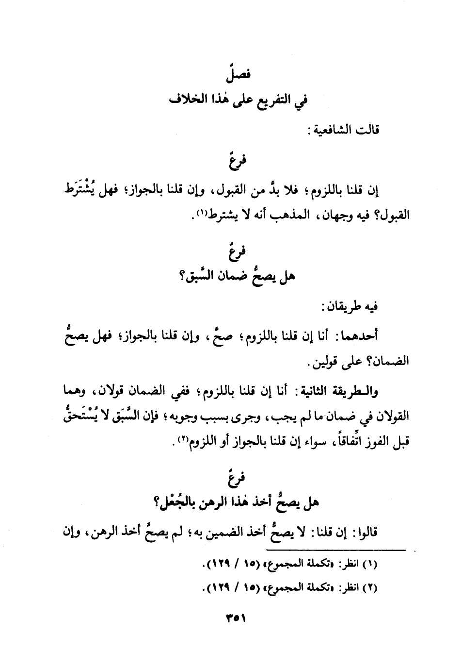 فِي التَّفْرِيع على هَذَا الْخلاف قَالَت الشَّافِعِيَّة فرع إِن قُلْنَا باللزوم فَلَا بُد من الْقبُول وَإِن قُلْنَا بِالْجَوَازِ فَهَل يشْتَرط الْقبُول فِيهِ وَجْهَان الْمَذْهَب أَنه لَا يشْتَرط فرع هَل يَصح ضَمَان السَّبق فِيهِ طَرِيقَانِ أَحدهمَا أَنا إِن قُلْنَا باللزوم صَحَّ وَإِن قُلْنَا بِالْجَوَازِ فَهَل يَصح الضَّمَان على قَوْلَيْنِ والطريقة الثَّانِيَة أَنا إِن قُلْنَا باللزوم فَفِي الضَّمَان قَولَانِ وهما الْقَوْلَانِ فِي ضَمَان مَا لم يجب وَجرى بِسَبَب وُجُوبه فَإِن السَّبق لَا يسْتَحق قبل الْفَوْز اتِّفَاقًا سَوَاء إِن قُلْنَا بِالْجَوَازِ أَو اللُّزُوم فرع هَل يَصح أَخذ هَذَا الرَّهْن بالجعل قَالُوا إِن قُلْنَا لَا يَصح أَخذ الضمين بِهِ لم يَصح أَخذ الرَّهْن وَإِن