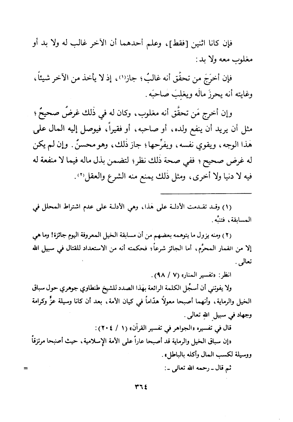 فَإِن أخرج من تحقق أَنه غَالب جَازَ إِذْ لَا يَأْخُذ من الآخر شَيْئا وغايته أَنه يحرز مَاله ويغلب صَاحبه