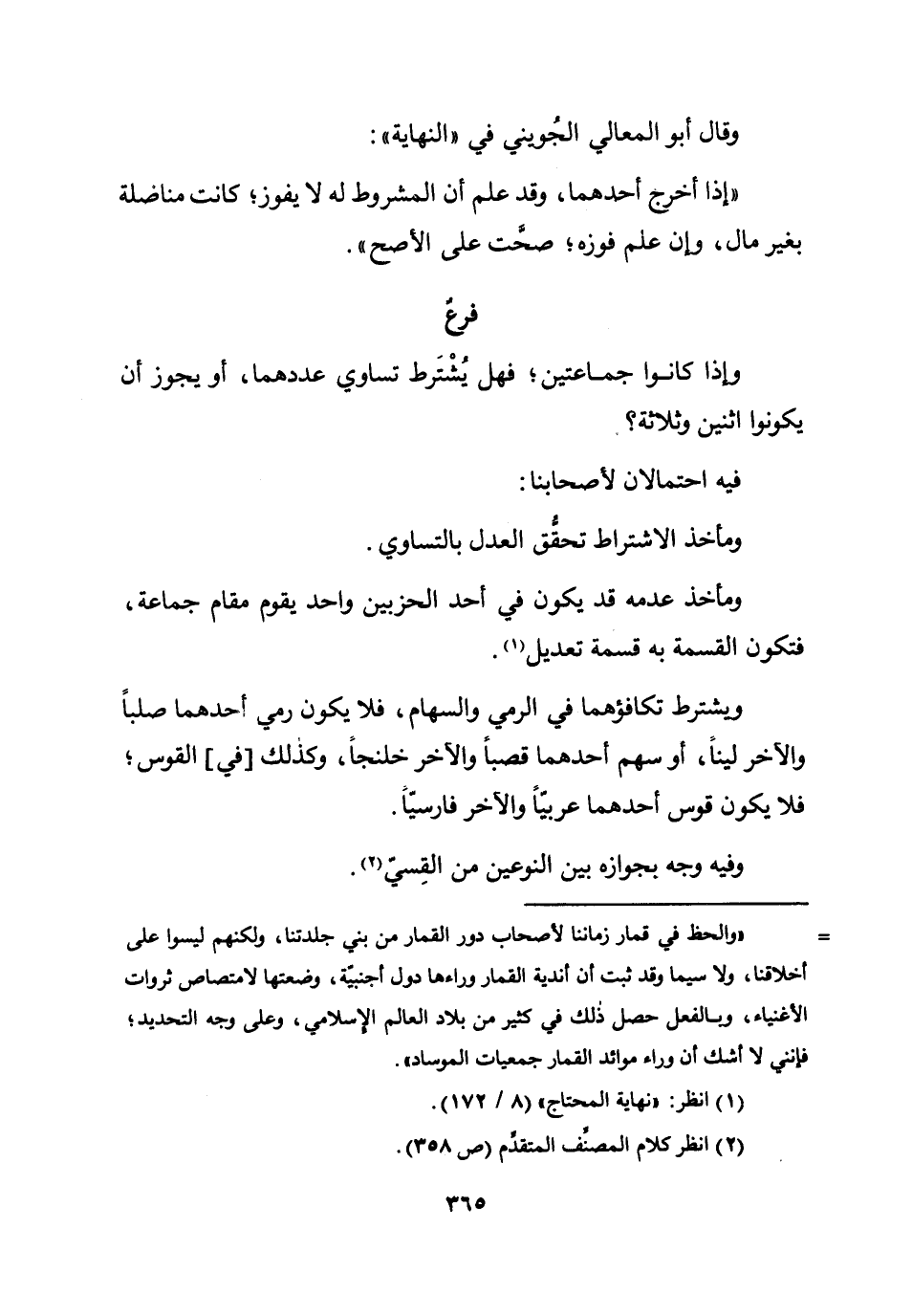وَيشْتَرط تكافؤهما فِي الرَّمْي والسهام فَلَا يكون رمي أَحدهمَا صلبا والأخر لينًا أَو سهم أَحدهمَا قصبا وَالْآخر خلنجا وَكَذَلِكَ فِي الْقوس فيا يكون قَوس أَحدهمَا عَرَبيا وَالْآخر فارسيا