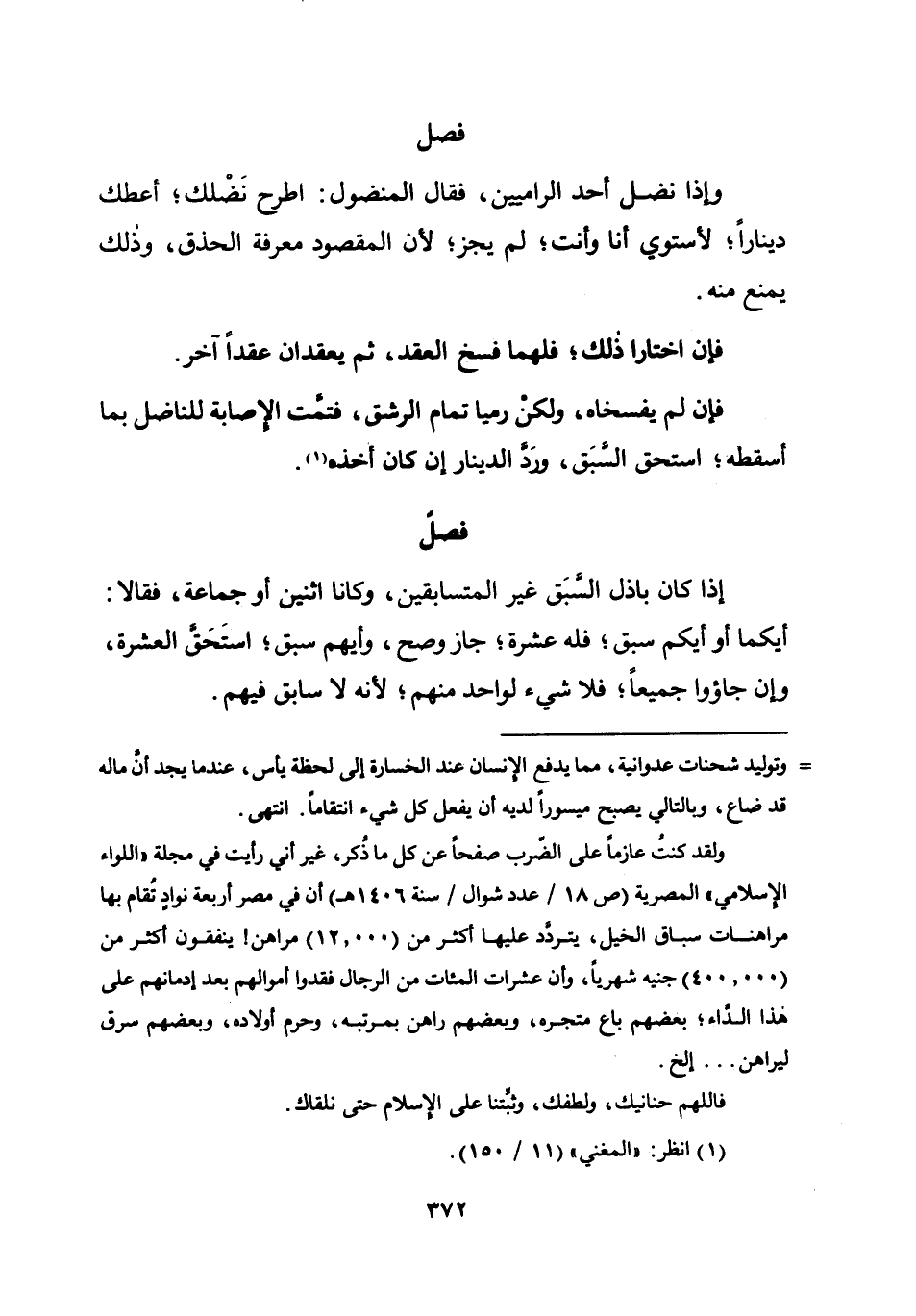 وَإِذا نضل أحد الراميين فَقَالَ المنضول اطرَح نضلك أعطك دِينَار لأستوي أَنا وَأَنت لم يجز لِأَن الْمَقْصُود معرفَة الحذق وَذَلِكَ يمْنَع مِنْهُ