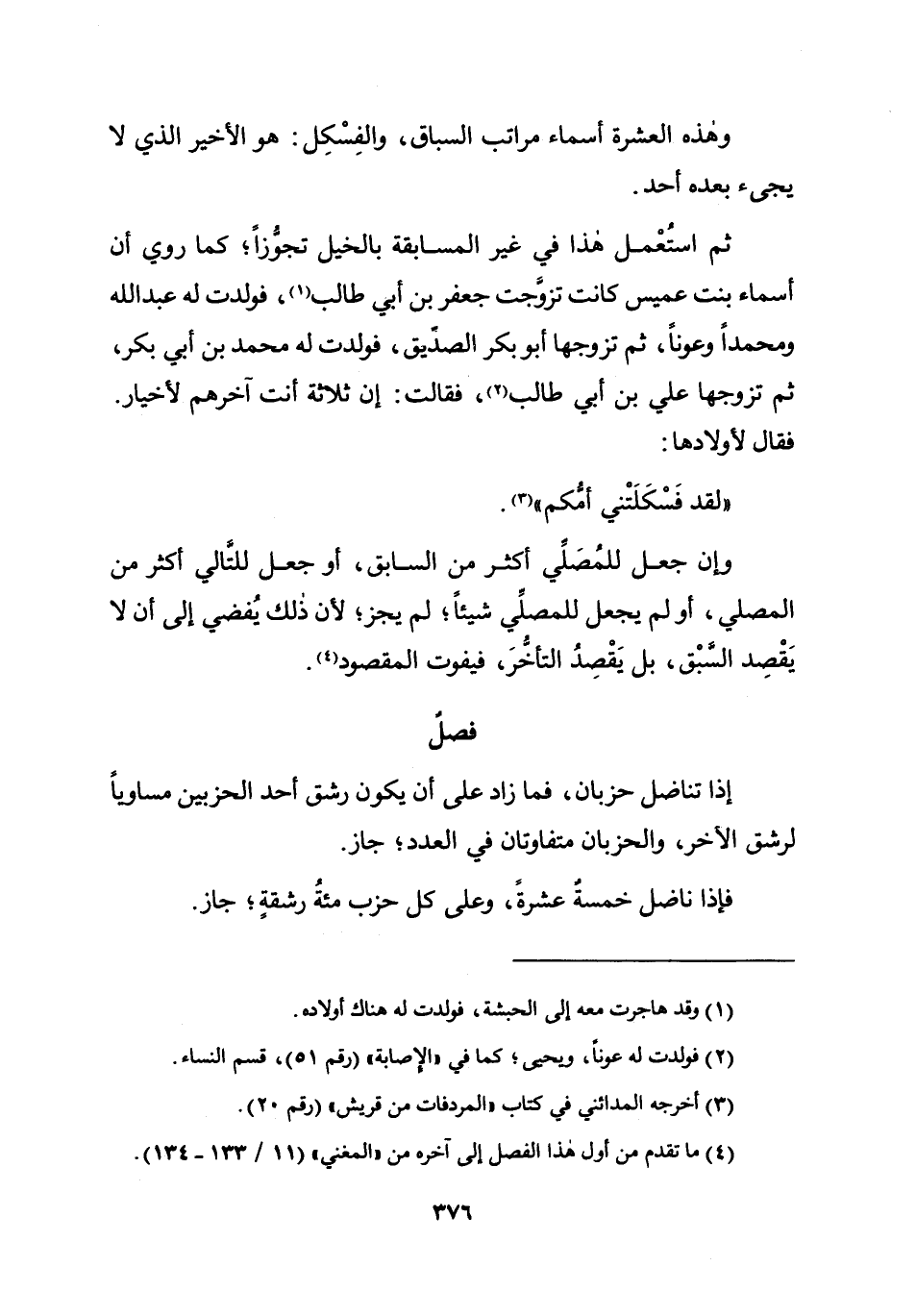 ثمَّ اسْتعْمل هَذَا فِي غير الْمُسَابقَة بِالْخَيْلِ تجوزا كَمَا رُوِيَ أَن أَسمَاء بنت عُمَيْس كَانَت تزوجت جَعْفَر بن أبي طَالب فَولدت لَهُ عبد الله ومحمدا وعونا ثمَّ تزَوجهَا أَبُو بكر الصّديق فَولدت لَهُ مُحَمَّد بن أبي بكر ثمَّ تزَوجهَا عَليّ بن أبي طَالب فَقَالَ إِن ثَلَاثَة أَنْت آخِرهم لأخيار فَقَالَ لأولادها