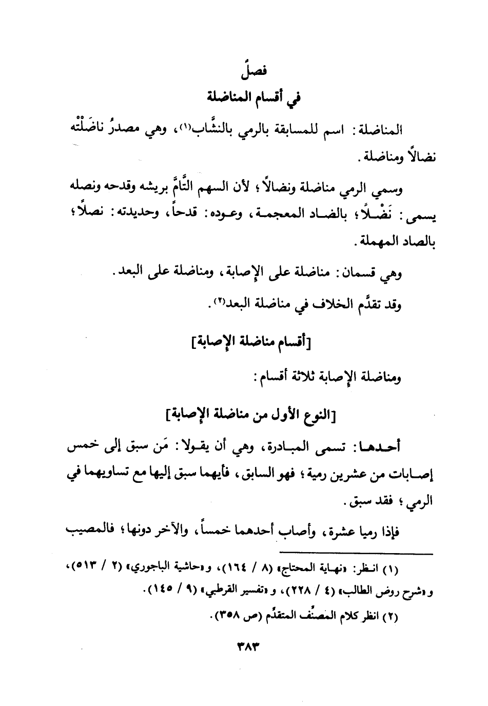 ومناضلة الْإِصَابَة ثَلَاثَة أَقسَام (النَّوْع الأول من مناضلة الْإِصَابَة) أَحدهَا تسمى الْمُبَادرَة وَهِي أَن يَقُولَا من سبق إِلَى خمس إصابات من عشْرين رمية فَهُوَ السَّابِق فَأَيّهمَا سبق إِلَيْهَا مَعَ تساويهما فِي الرَّمْي فقد سبق