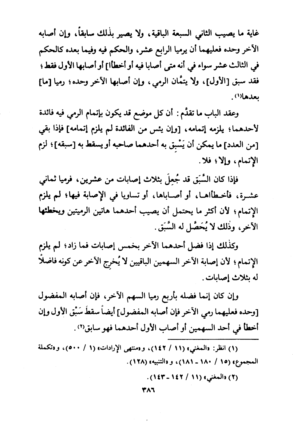 فَإِذا كَانَ السَّبق قد جعل إصابات من عشْرين فرميا ثَمَانِي عشرَة فأخطأاها أَو أصاباها أَو تَسَاويا فِي الْإِصَابَة فِيهَا لم يلْزم الْإِتْمَام لِأَن أَكثر مَا يحْتَمل أَن يُصِيب أَحدهمَا هَاتين الرميتين ويخطئها الآخر وَذَلِكَ لَا يحصل لَهُ السَّبق وَكَذَلِكَ إِذا فضل أَحدهمَا الآخر بِخمْس إصابات فَمَا زَاد لم يلْزم الْإِتْمَام لِأَن إِصَابَة الآخر السهمين البَاقِينَ لَا يخرج الآخر عَن كَونه فَاضلا لَهُ بِثَلَاث إصابات
