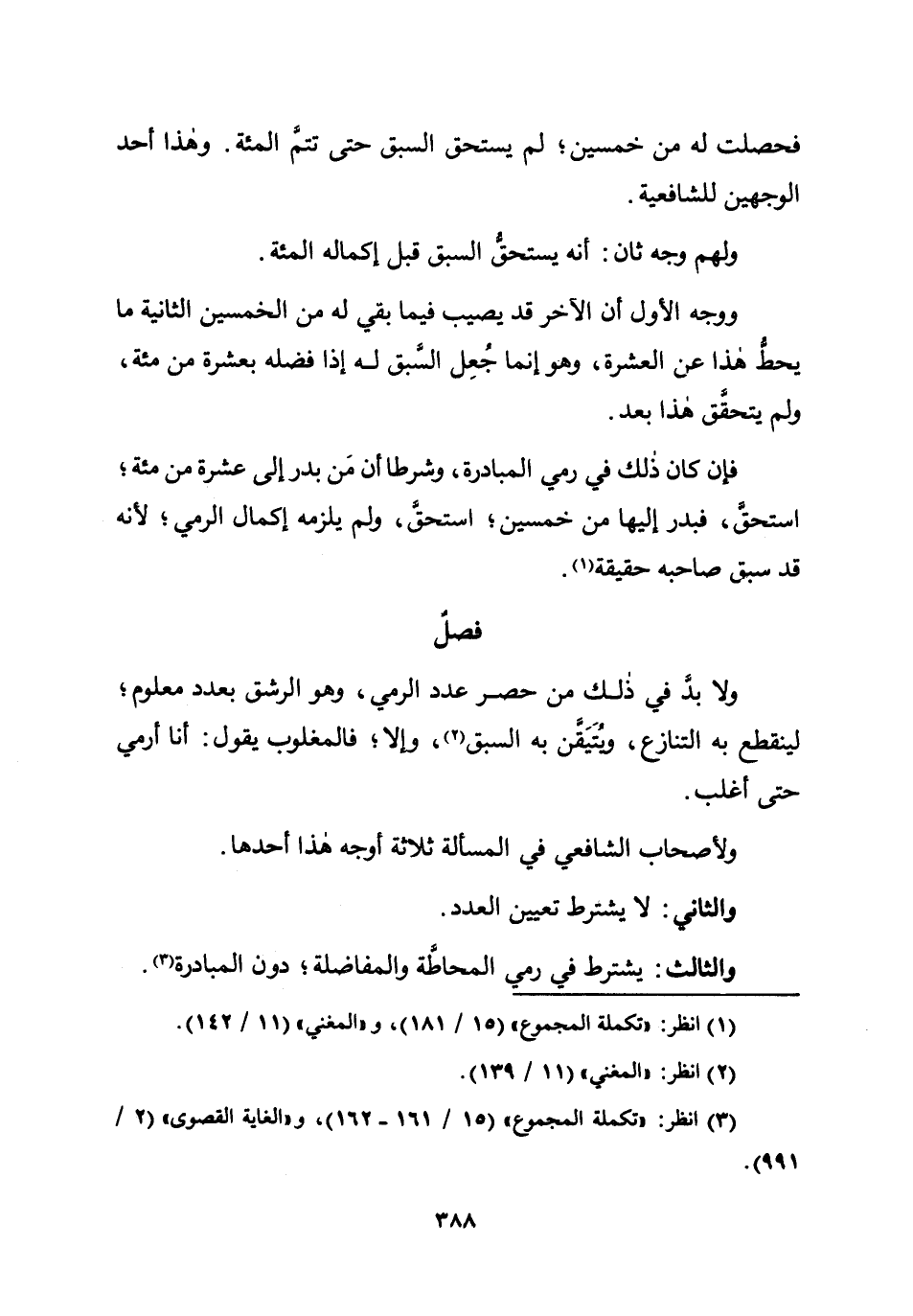 ولأصحاب الشَّافِعِي فِي الْمَسْأَلَة ثَلَاثَة أوجه هَذَا أَحدهَا وَالثَّانِي لَا يشْتَرط تعْيين الْعدَد وَالثَّالِث يشْتَرط فِي رمي المحاطة والمفاضلة دن الْمُبَادرَة